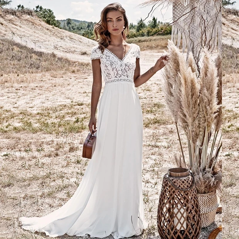 Очаровательные кружевные свадебные платья Горячая Распродажа Бохо Свадебные платья с коротким рукавом и V-образным вырезом для невесты с открытой спиной со шлейфом