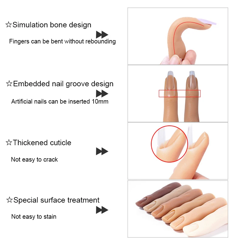 Наша силиконовая рука была обновлена ногтевая кровать, что вы можете вставить ногти в ногтевую кровать около 10 мм без клея, тогда вы можете сделать своими руками свой Нейл-арт, как вам нравится. Или если вы хотите плотно прикрепить ногти к ногтевым концам, вы можете использовать акриловый клей, чтобы наклеить ногти на ногтевую кровать.