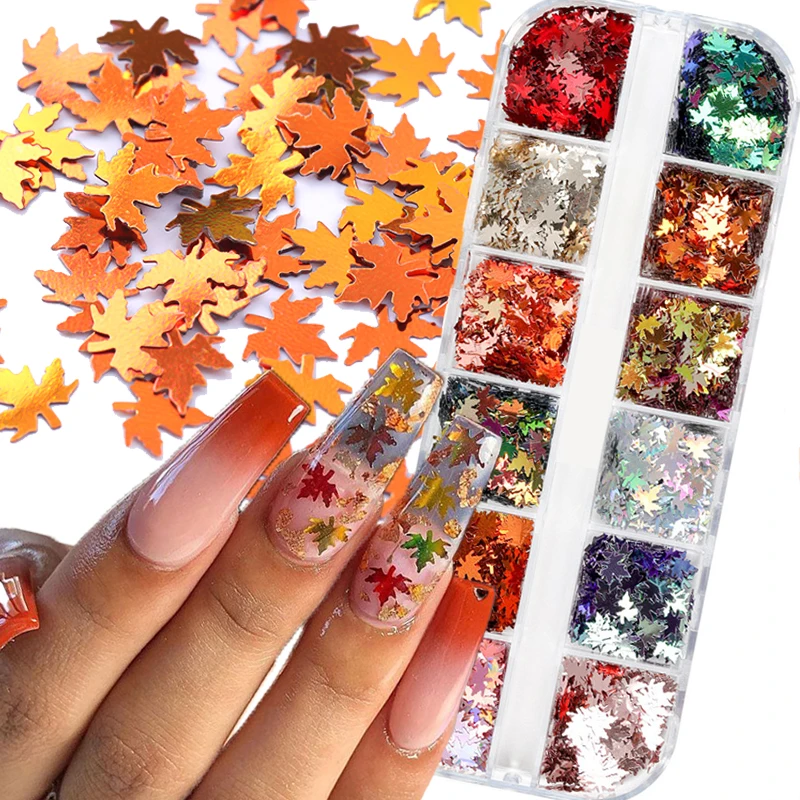 Блестки для дизайна ногтей, кленовые листья, рождественские снежинки, блестящие пайетки, осень, маникюр гвоздь, 12 ленткоробка