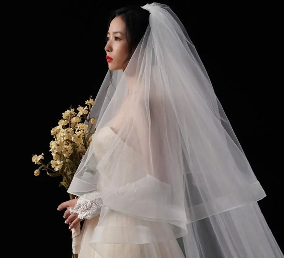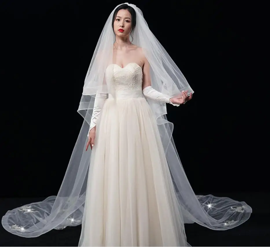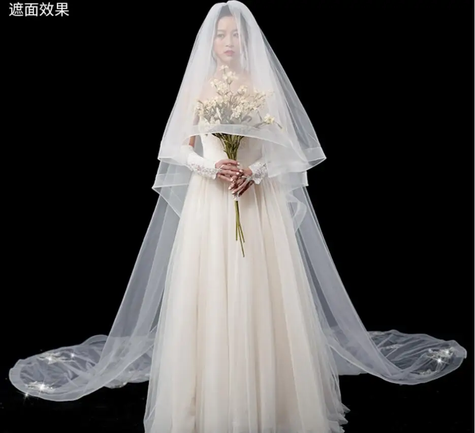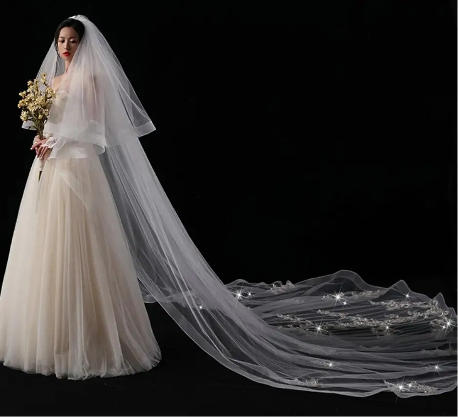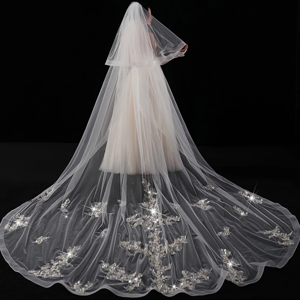 Свадебная фата с длинным хвостом для невесты, Тюлевая накидка на лицо, свадебный головной убор с аппликацией, реквизит для фото