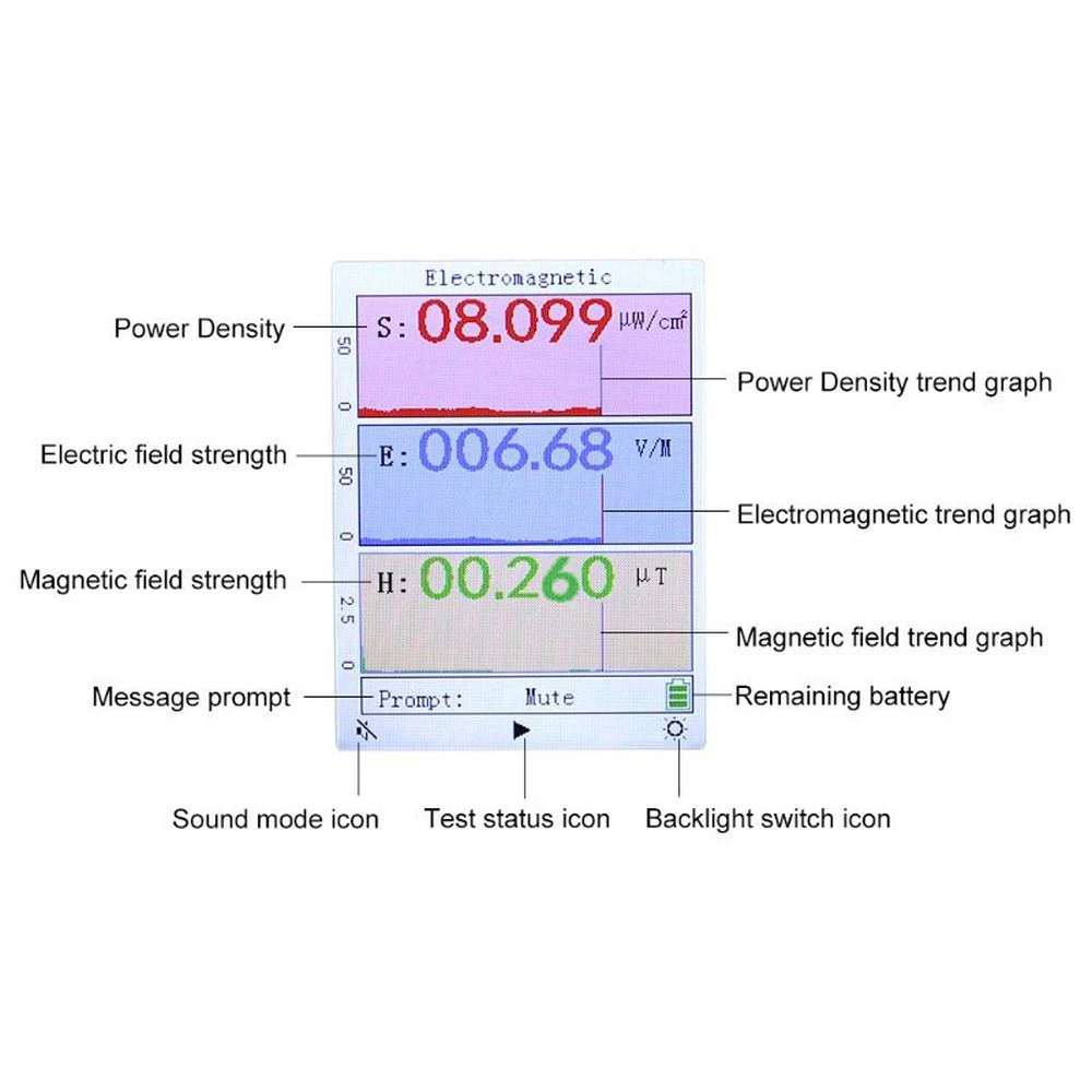 ☞Большой экран облегчает Считывание данных, и кнопки просты в эксплуатации. ☞Корпус изготовлен из высококачественного АБС-пластика, который обладает высокой термостойкостью и холодным сопротивлением, высокой прочностью и тонкой прочностью. ☞Он может удовлетворить потребности в домашнем обнаружении жизни, обнаружении подстанций, обнаружении башни мобильного сигнала и т. д., и его легко и удобно носить с собой. ☞С режимом отключения звука и будильника, тестовым и пауза режимом, и подсветка может быть включена или выключена. ☞Высокая чувствительность, широкий диапазон измерений, долговечные преимущества. Ежедневное использование помогает избежать радиационных опасностей. Характеристики: Материал: АБС-пластик Цвет: синий Модель: BR-9A Экран Размер: 57*43 мм/2,2 * 1.7in Диапазон испытаний: Мощность Плотность: 0-99.999μw/c㎡ Интенсивность электрического поля: 0-999,99 в/м Интенсивность магнитного поля: 0-99.999μT Точность теста: Мощность Плотность: 0,001 мкВт/c㎡ Напряженность электрического поля: 0,01/м Интенсивность магнитного поля: 0.001μT Частотный диапазон: Плотность мощности: 50 МГц-5 ГГц Интенсивность электрического поля: 20 Гц-100 МГц Интенсивность магнитного поля: 20 Гц-1 МГц Батарея: 3 * AA (не включены) 1,5 V Батарея или 3*1,2 V аккумуляторная Батарея (не входит в комплект) Зарядка: USB 5V 2A вход Время зарядки: ≥ 4 часа Размер изделия: 105*70*30 мм/4,1*2,8 * 1.2in Вес товара: 100 г/3,5 унции Размер посылка: 150*100*55 мм/5,9*3,9 * 2.2in Посылка Вес: 165 г/5,8 унции Посылка: 1 * Детектор электромагнитного излучения