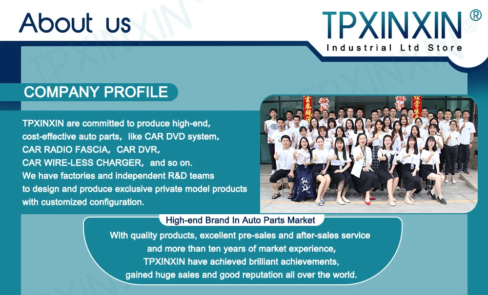 Лидирующий бренд на рынке автозапчастейTPXINXIN стремится производить высококачественные, экономически эффективные автозапчасти, такие как автомобильная DVD система автомобильного радио фасции. Автомобильный видеорегистратор. Автомобильное беспроводное зарядное устройство. И так далее. У нас есть factoriesand независимые R & D команды для разработки и производства эксклюзивных частных модельных продуктов с индивидуальной конфигурацией.