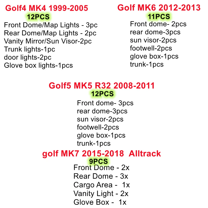 Передний купол-3 шт.Задний dome-3pcsVisor-2pcs от солнцаFootwell-2pcsПерчатки box-1pcsTrunk-1pcsЗапасная лампа:-4x
