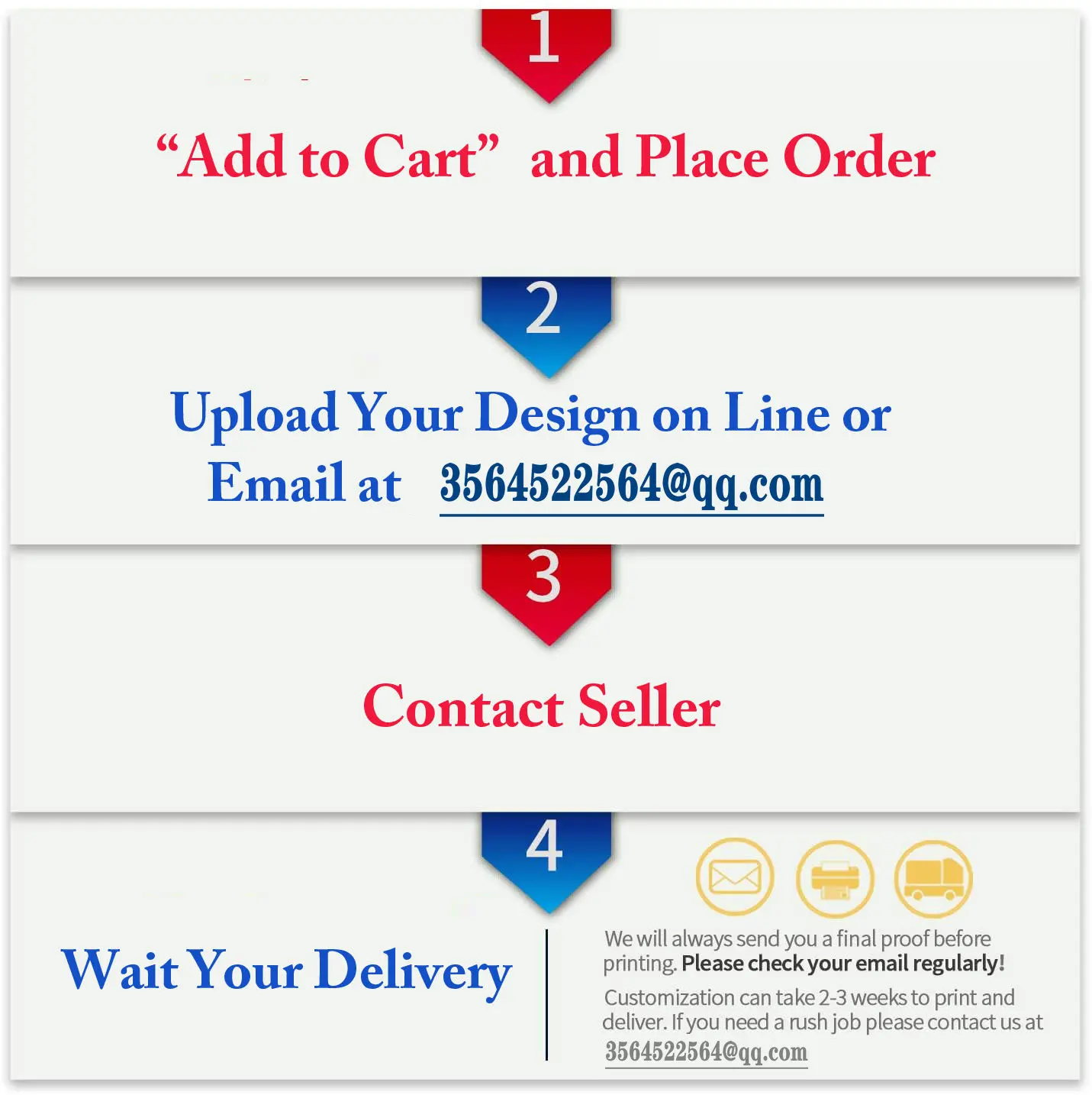 Для пользовательского логотипа, если это обычный размер, вам нужно только оплатить по ссылке и отправить дизайн онлайн или по электронной почте. Если это не обычный логотип размера, пожалуйста, свяжитесь с нами, и мы предоставим цену вовремя.