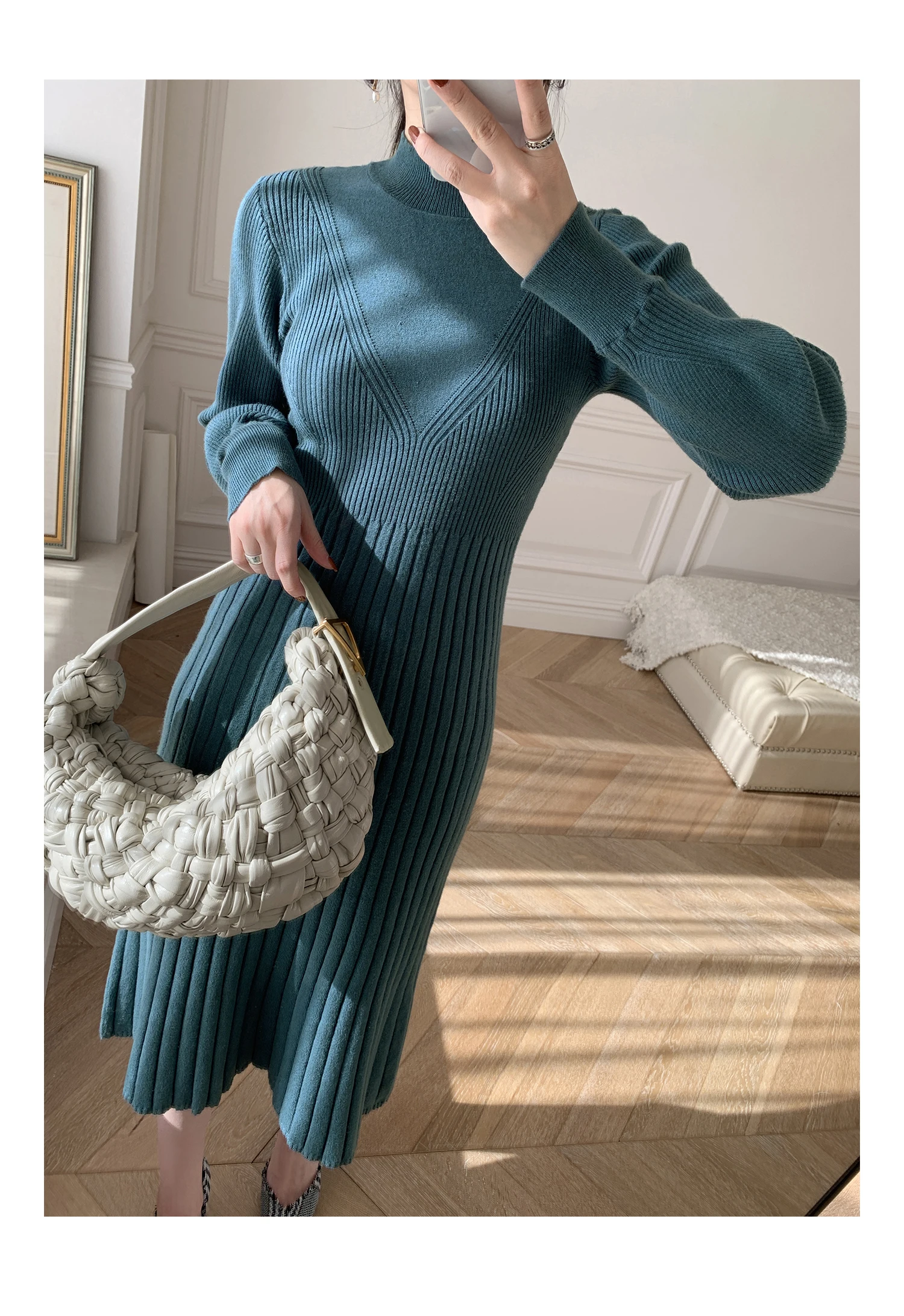 Женская шерстяная водолазка, синее платье-свитер макси в Корейском стиле, Осень-зима