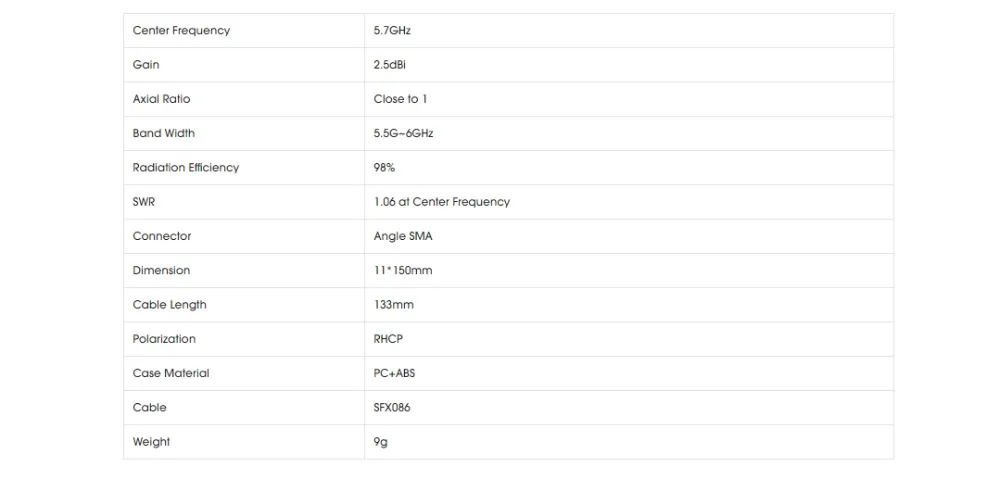 Вес: SMA и RP-SMA 4,7g/угол MMCX 3,2g/прямой MMCX 3,1g/U.FL 1,6g (опционально)