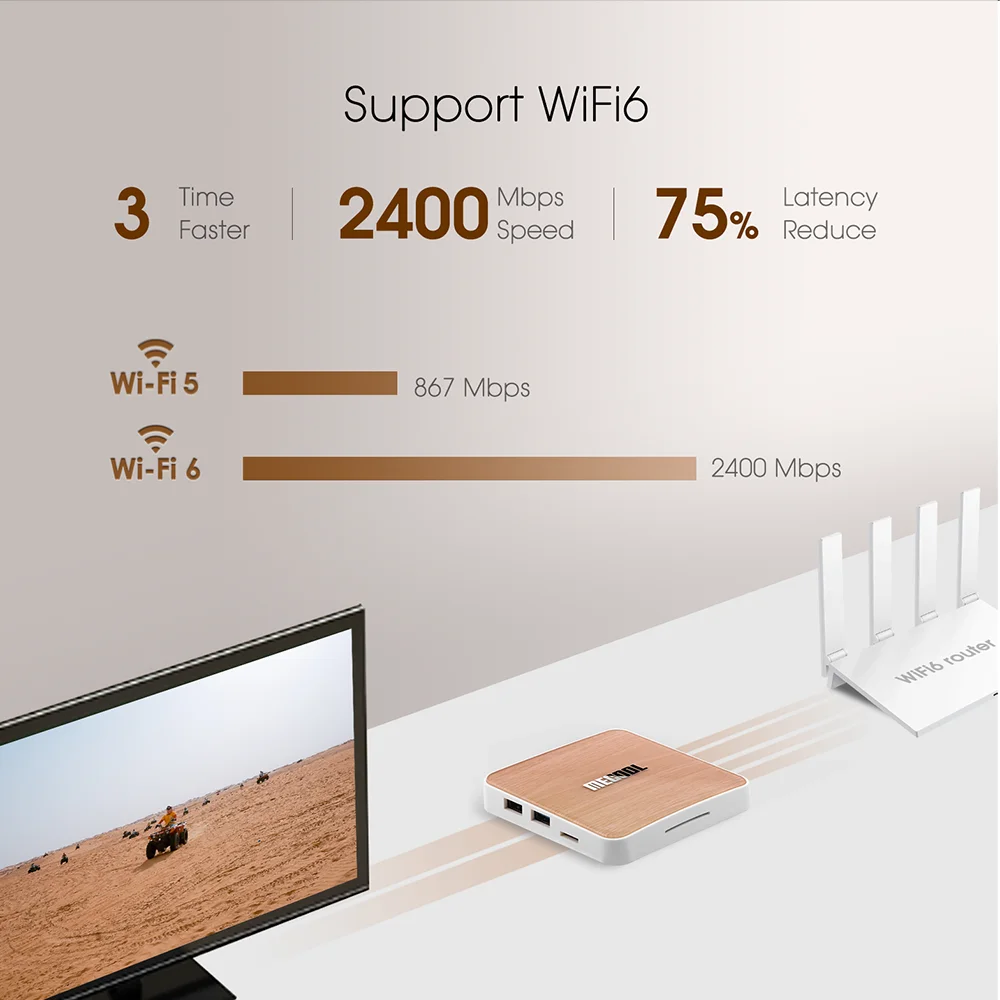 -Два варианта коробки Mecool KM6:A: KM6 CLASSIC-2GB + 16 ГБ + двойной Wifi + BT4.2 + 100 мB: KM6 DELUXE-4GB + 32 ГБ + Wifi 6 + BT5.0 + 1000 мB: KM6 DELUXE-4GB + 64 ГБ + Wifi 6 + BT5.0 + 1000 м