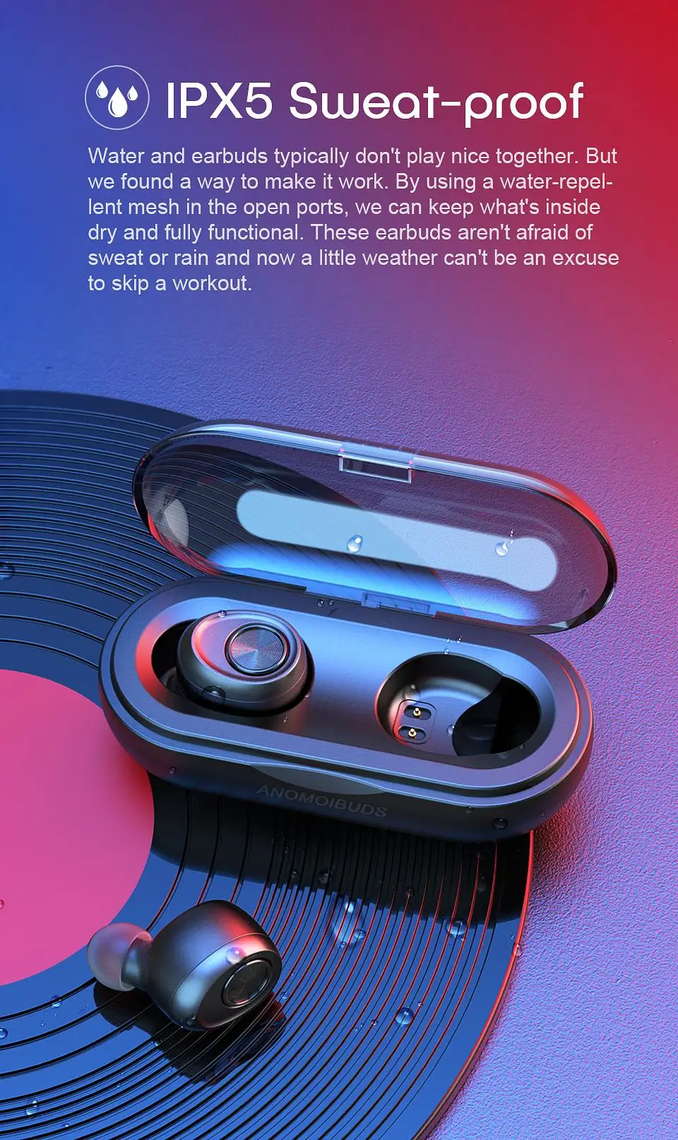 Наушники могут достигать водонепроницаемого уровня IPX5, а зарядное устройство не является водонепроницаемым.