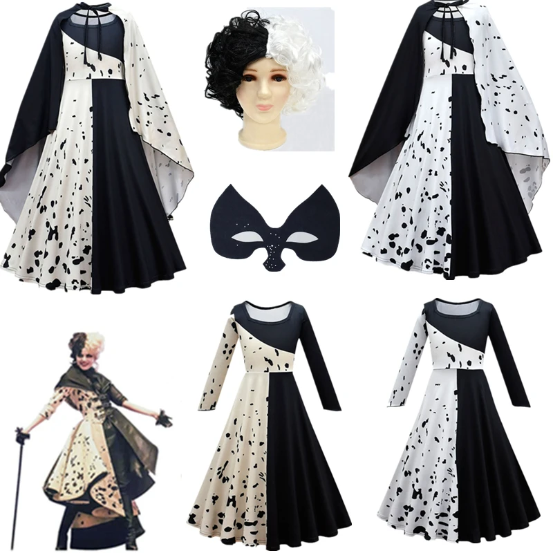 Костюм для косплея мадам Круэлла из фильма зло, детское черно-белое платье принцессы, одежда для Хэллоуина и вечеринки с накидкой и париком
