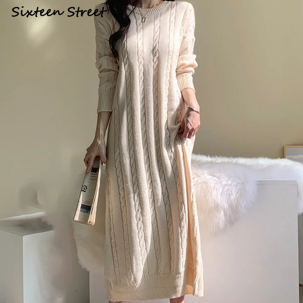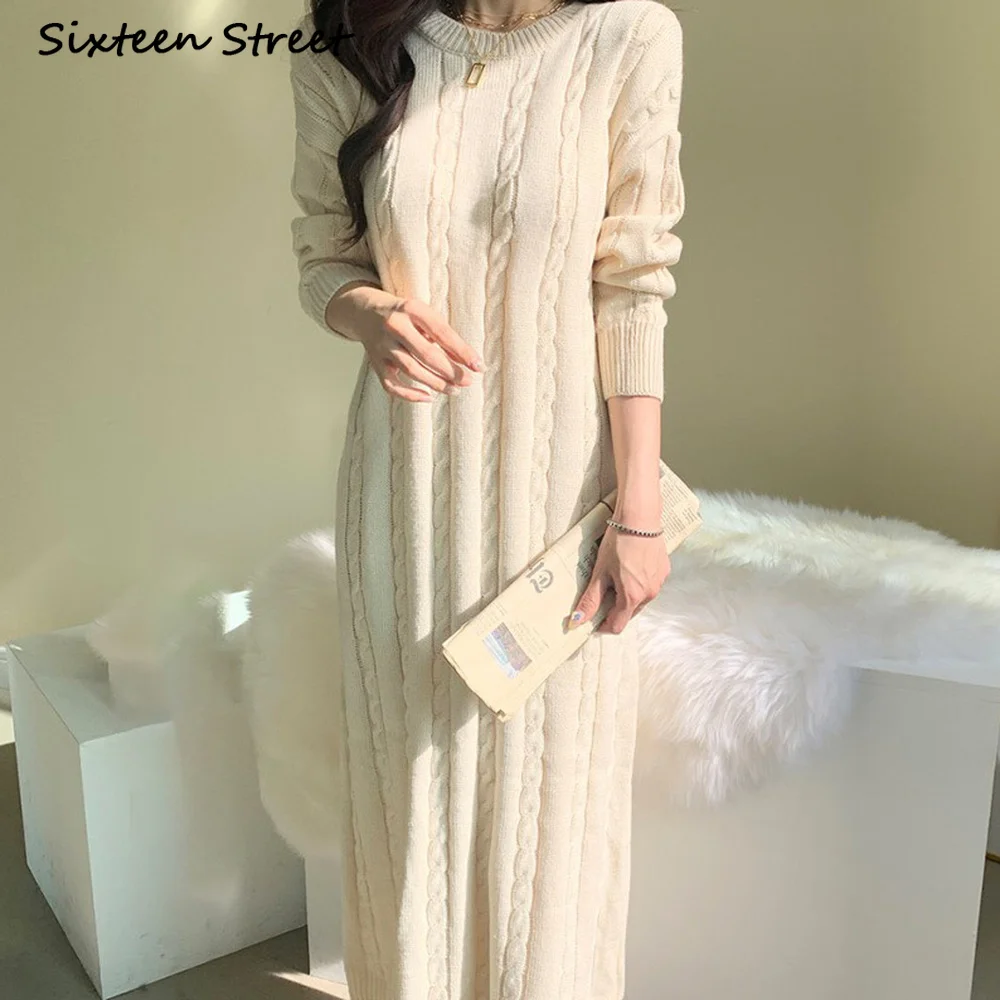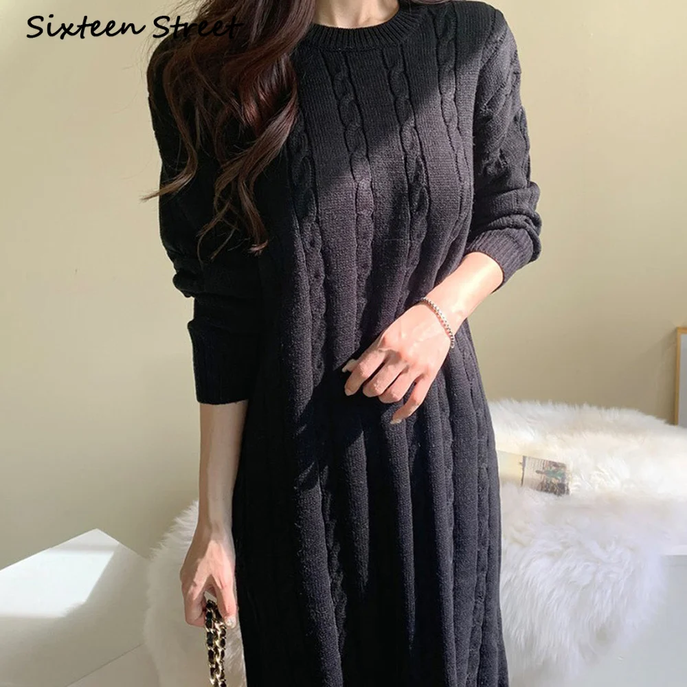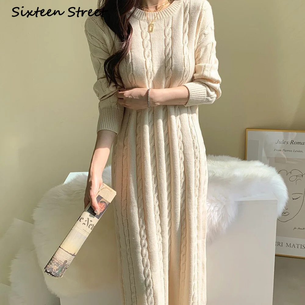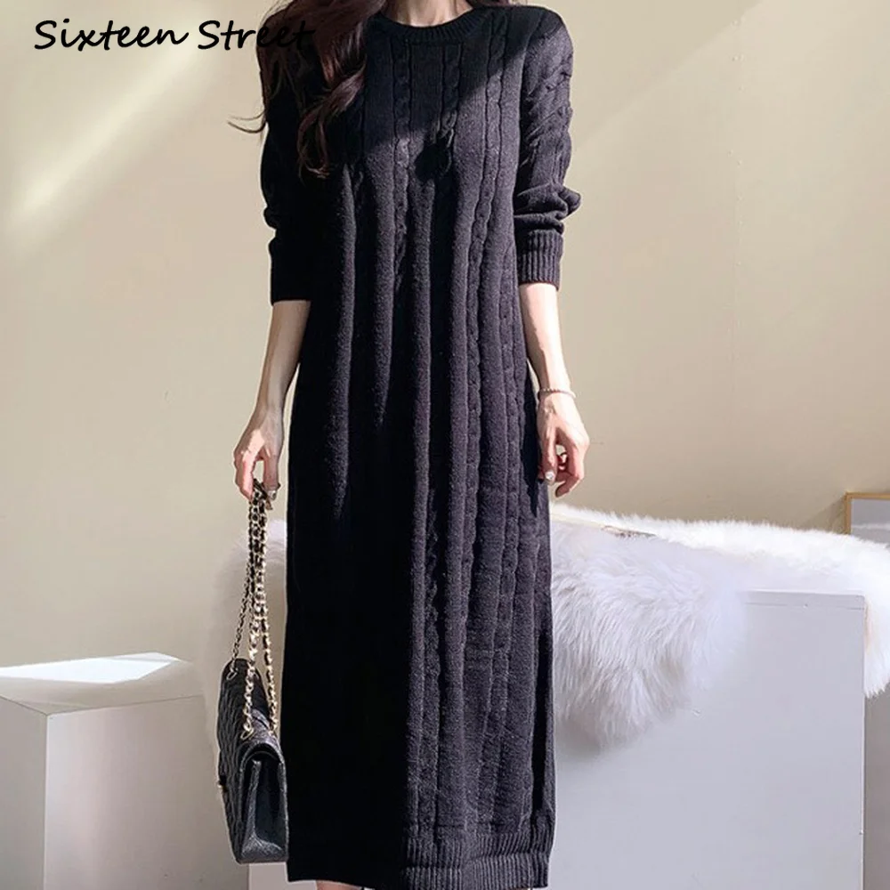 Корейский модный шикарный осенне-зимний вязаный свободный утепленный шерстяной свитер с круглым вырезом вязаные платья макси для женщин элегантные винтажные 2021