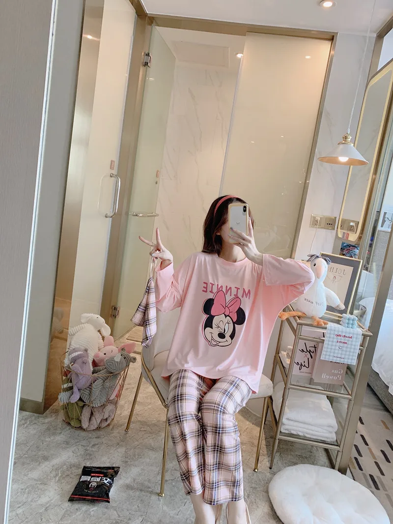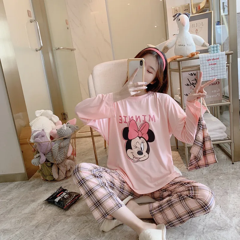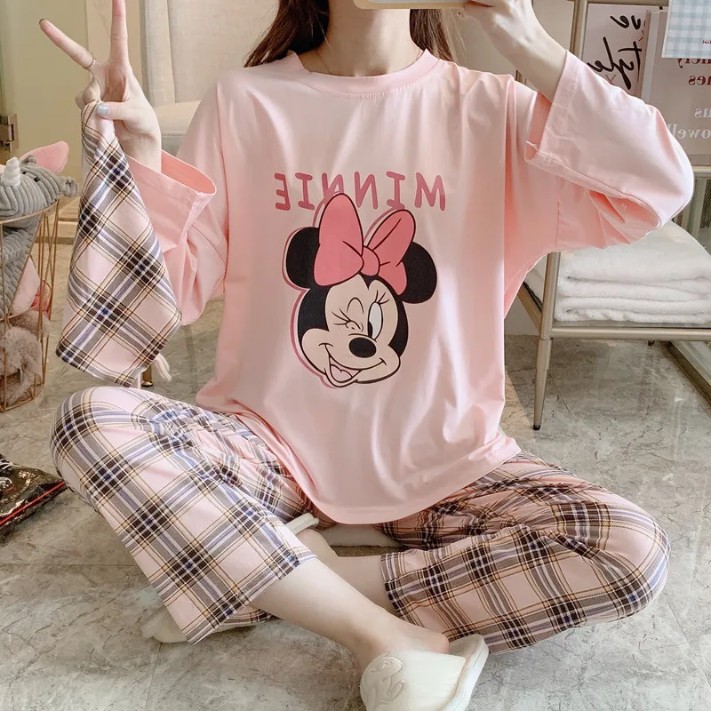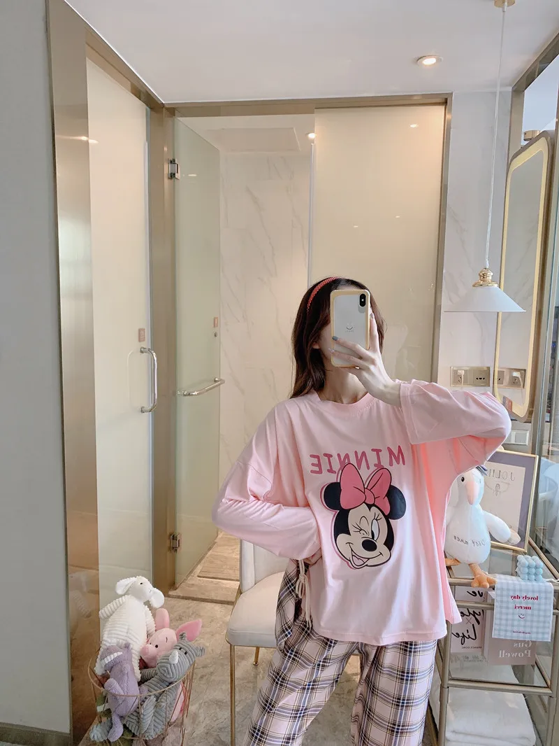 Мультяшные пижамы Disney, Микки, Минни, Стич, медведь, животные, парные пижамы, Хлопковая женская пижама с длинным рукавом для женщин