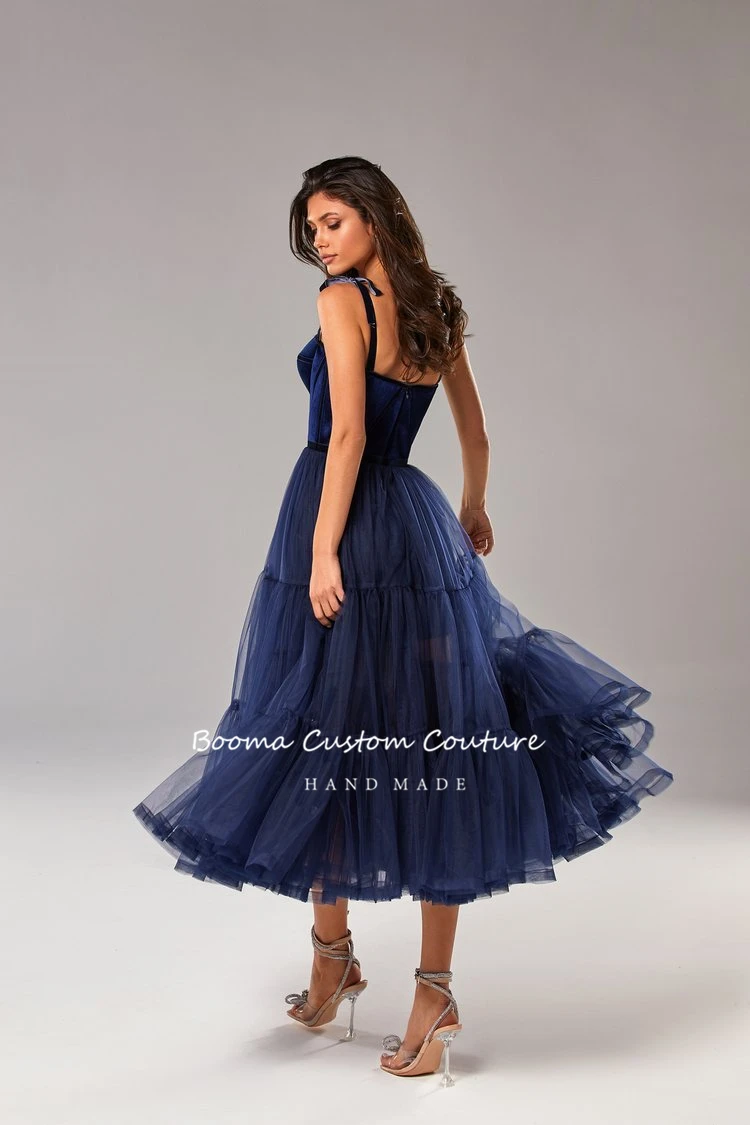 Платье-миди из фатина с бантом на бретельках, темно-синее