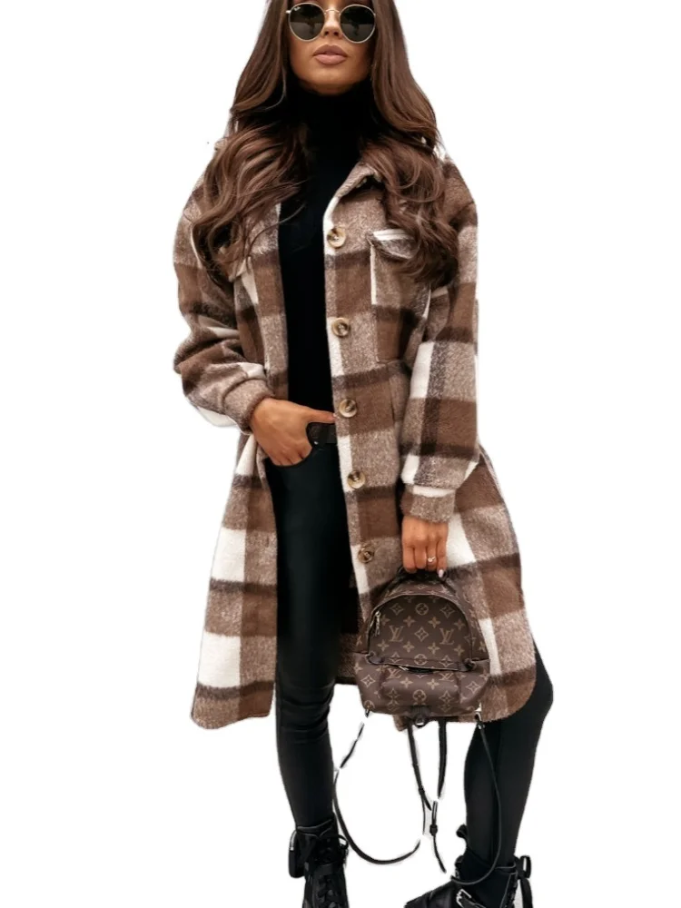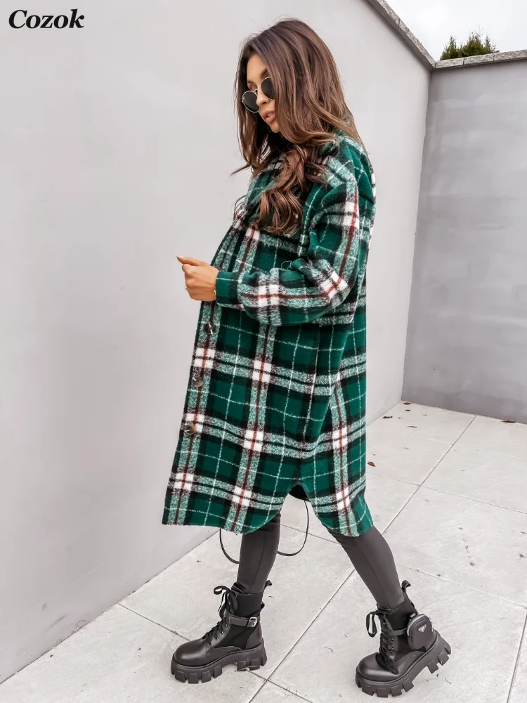 Осень 2021, модная женская куртка в клетку с принтом, Отложное пальто, свободное Женское пальто, теплый тренчкот с длинным рукавом для женщин