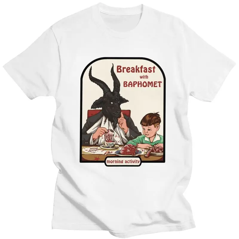 Футболка мужская классическая с надписью завтрак с Baphomet, хлопковая тенниска с короткими рукавами, топ с дьяволом, демоном, уличная одежда