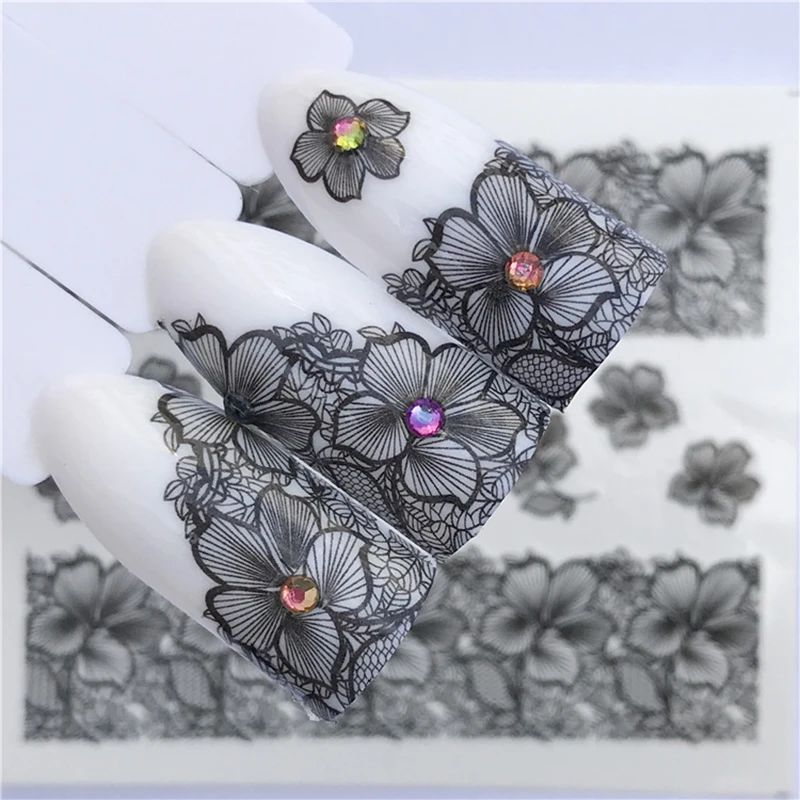 3D черные кружевные цветочные наклейки серии для нейл-арта, водные ...