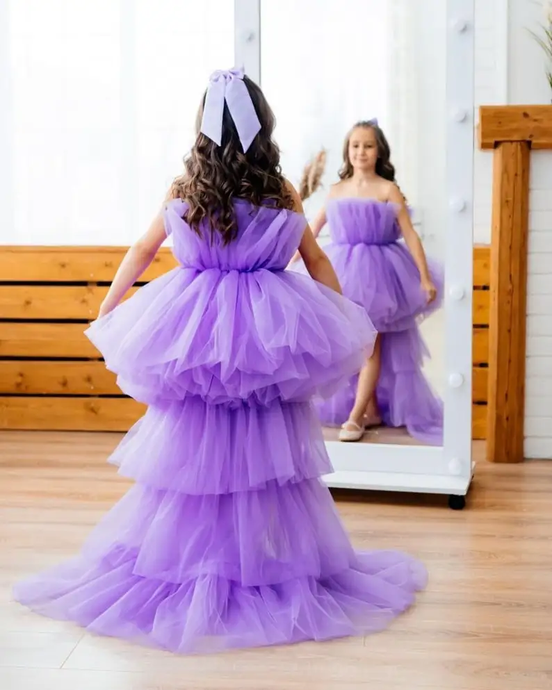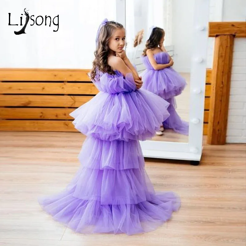 Лавандовое Пышное Платье для девочек со шлейфом, милое детское Тюлевое платье-пачка с цветами для девочек, 2021, платье принцессы для дня рождения