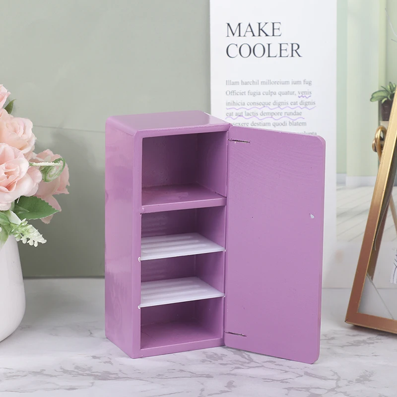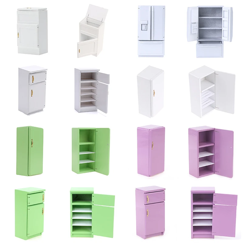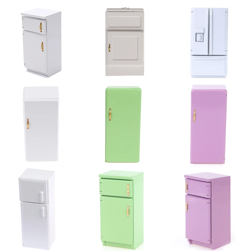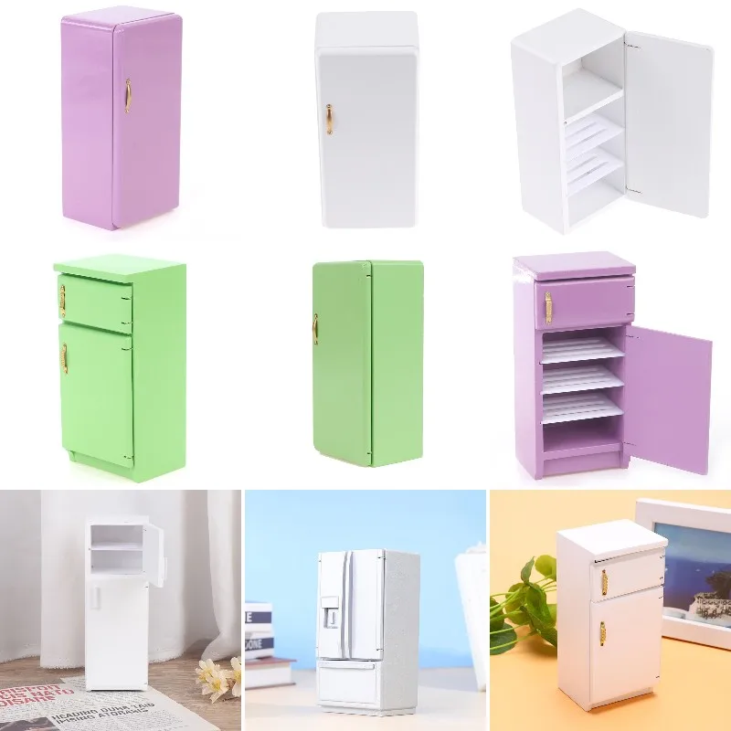 1:12 Миниатюрный Кукольный домик, белая, зеленая, фиолетовая мебель, деревянная модель холодильника, игрушки, декор кукольного домика