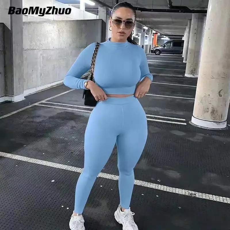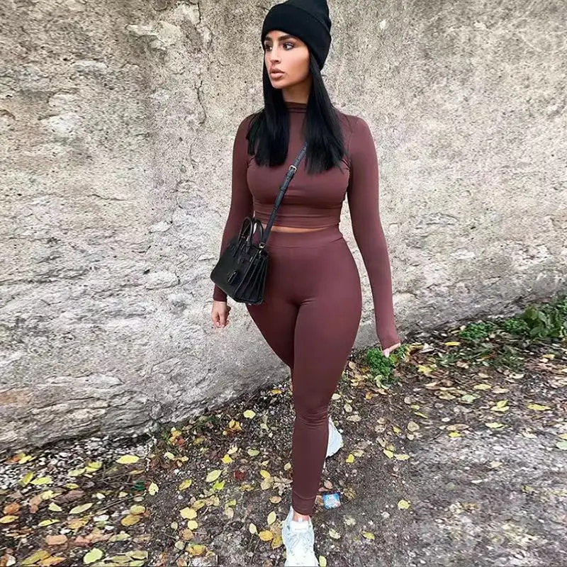 Женский спортивный костюм из двух предметов, однотонный комплект из двух предметов, укороченный Топ с длинным рукавом и леггинсы с высокой талией, весна 2022