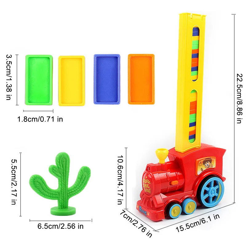 Характеристика: 1. Заполните картридж и начните поезд, чтобы положить домино. Все домино объединены, чтобы помочь создать самое крутое домино, которое вы можете себе представить. Идеальная игрушка или подарок для развития терпения и счетных навыков вашего ребенка. Поднимите их и сбивайте 2. Отличная развивающая игрушка, которая развивает математику, науку, пространство и тактильные навыки вашего ребенка и развивает воображение вашего ребенка в веселых играх 3. Могут быть развивающие игрушки, также могут быть использованы в качестве рождественских подарков, подарков на Хэллоуин, детских сюрпризов на день рождения и пазлов, давая детям счастливое развлекательное время Параметры Материал: пластик и электронный компонент Продукт Размеры: 22,5x15,5x7 см/8.9x6.1x2.8inch Размер посылка: 33x8x24 см Питание: 2 батарейки типа АА (не входят в комплект) Посылка включает в себя: 1 x домино поезд (без батареи) 60 пластиковых блоков (4 цвета) Аксессуары для кактуса-1 шт. Дополнительная карта домино 20 шт.(Опционально)