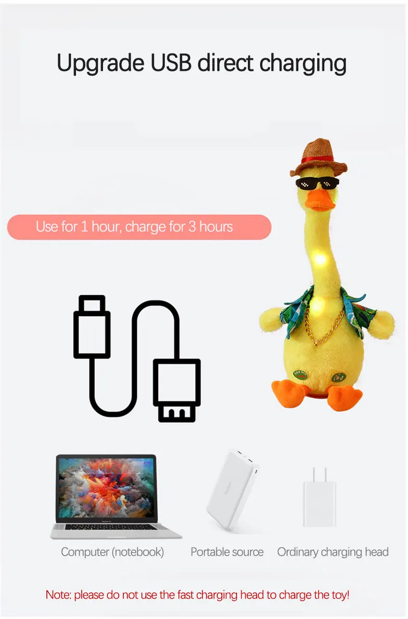 Таблица размеров:Прибл. 36x1 6 см/14x6.2дюймаОписание:Эта электрическая игрушка-утка может спеть и танцевать, что очень привлекательно. Это прекрасная забавная игрушка и креативный подарок.Характеристики:Форма: уткаМатериал наполнения: полипропиленовый хлопокФункция: светильник + запись + говорение + пениеОписание:Плюшевая игрушечная утка, мягкая на ощупь, прочная и безопасная для использования.Яркий цветной дизайн, прекрасный звук и прекрасные действия подарят счастливое время для ваших малышей.Многофункциональность: Эта плюшевая игрушечная собака может записывать и повторять то, что вы сказали, танцует, поет, привлекает внимание детей и хорошо подходит для раннего образования.Отлично подходит для детей/малышей/взрослых подарок на день рождения/подарок на Рождество и т. д.Подходит для всех возрастов. С 120 песнями на английском языке для вас на выбор.Посылка включает в себя:Посылка включает в себя:1 шт Танцующая утка плюшевая кукла USB Тип зарядки (USB зарядный кабель в комплекте)