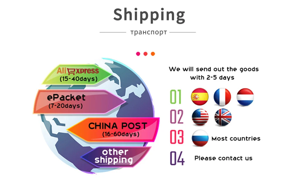 Принимаем следующие транзакции:1. Розничная торговля: Мы принимаем Розничные сделки от всех клиентов по всему миру. Мы не устанавливаем минимальные требования для всех продуктов. Оптовая продажа: Мы принимаем Оптовые сделки от всех клиентов по всему миру. Чтобы уменьшить давление на инвентарь, мы устанавливаем, чтобы партия была больше или равна 2 шт.. Если вы хотите оптовую или оптовую продажу, пожалуйста, свяжитесь с нами, мы обсудим оптовые цены, методы доставки и т. д. мы считаем, что можем достичь удовлетворительного соглашения. Агент по доставке: если вы являетесь зарубежным онлайн-продавцом, мы можем предоставить вам услугу агента по доставке. При торговле, пожалуйста, сообщите нам, что ваши покупатели четко объяснили информацию, мы постараемся сделать все возможное, чтобы предоставить вам услуги, в то же время, мы полностью уважаем ваши бизнес-секреты, И никогда не будет делать ничего вредного для ваших интересов. Если ваша страна и регион не находятся в стране бесплатной доставки, вы можете связаться с нами, и мы предоставим вам лучший способ доставки.2. Транспортировка: наши товары поставляются из материкового Китая. После успешного платежа мы отправим его в течение 3-5 рабочих дней. Ваши товары обычно прибывают в течение 7-50 рабочих дней. В редких случаях это может быть задержано в зависимости от погоды, скорости и товаров в вашей стране. После отправки товара мы будем активно отслеживать ваш статус доставки. Мы обычно используем Почта Китая для транспортировки посылок. Как правило, товары будут доставлены в течение 15-30 дней. Но есть и другие ситуации, которые могут быть отложены, такие как задержка плохой погоды в вашу страну и задержка почтовой системы в местное почтовое отделение. В результате, самый длинный срок доставки в Китае составляет 50 дней. Для транзитных клиентов мы также можем использовать «ZTO Express» для транспортировки в течение 30 дней.3. Тариф: когда товары прибывают в вашу страну, некоторые страны могут иметь определенные тарифы. Эта часть вашей ответственности будет оплачена вами. Мы отметим его в качестве подарка или уменьшаем стоимость товаров, чтобы сэкономить некоторые таможенные расходы.4. Послепродажное обслуживание: все товары, которые мы