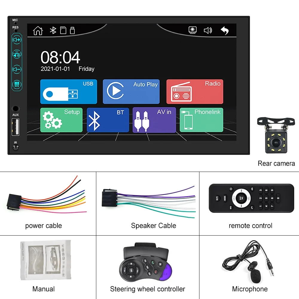 1 х Автомобильный MP5 плеер1 х Кабель питания1 х аудиокабельПульт ДУ (1 шт.);1 х пульт дистанционного управления рулем1 x Внешний микрофонРуководство пользователя (1 шт.)