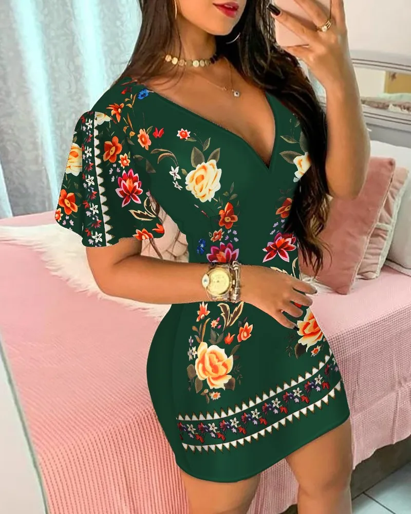 Облегающее платье с цветочным принтом и оборками на рукавах