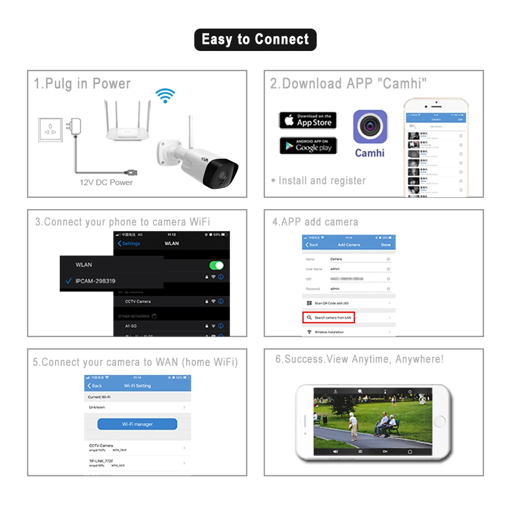 1. Загрузите и установите CamHi, откройте приложение и нажмите кнопку добавить камеру;2. Введите devuce cloud ID и passward;3. Подключение успешно.