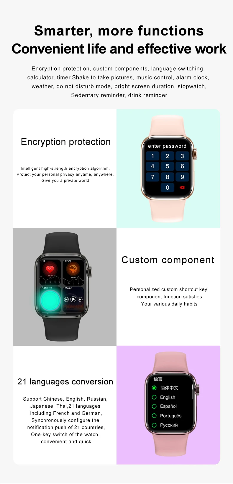 Защита от шифрования, пользовательские компоненты, калькулятор переключения языков, таймер, встряхивание для фотографирования, управление музыкой, погода будильника, режим «Не беспокоить», продолжительность яркого экрана, секундомер напоминание о сидячем положении, напоминание о напитке