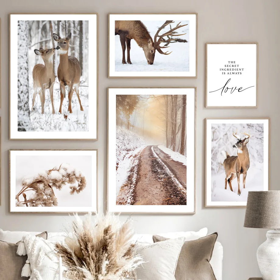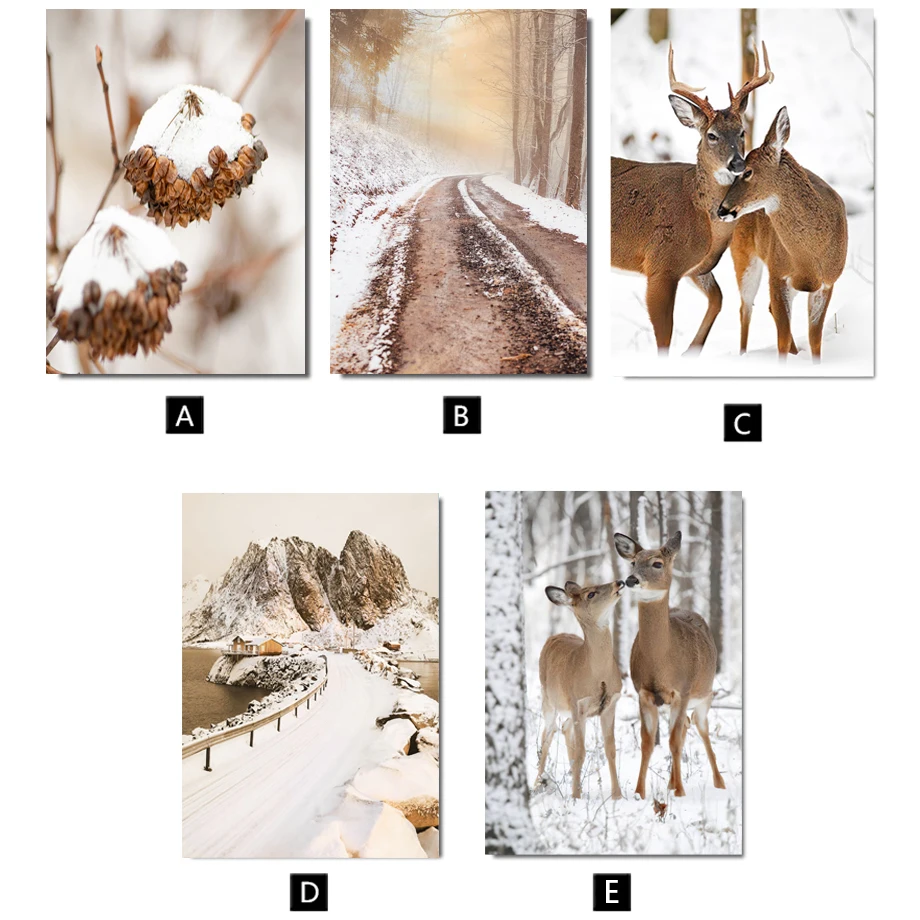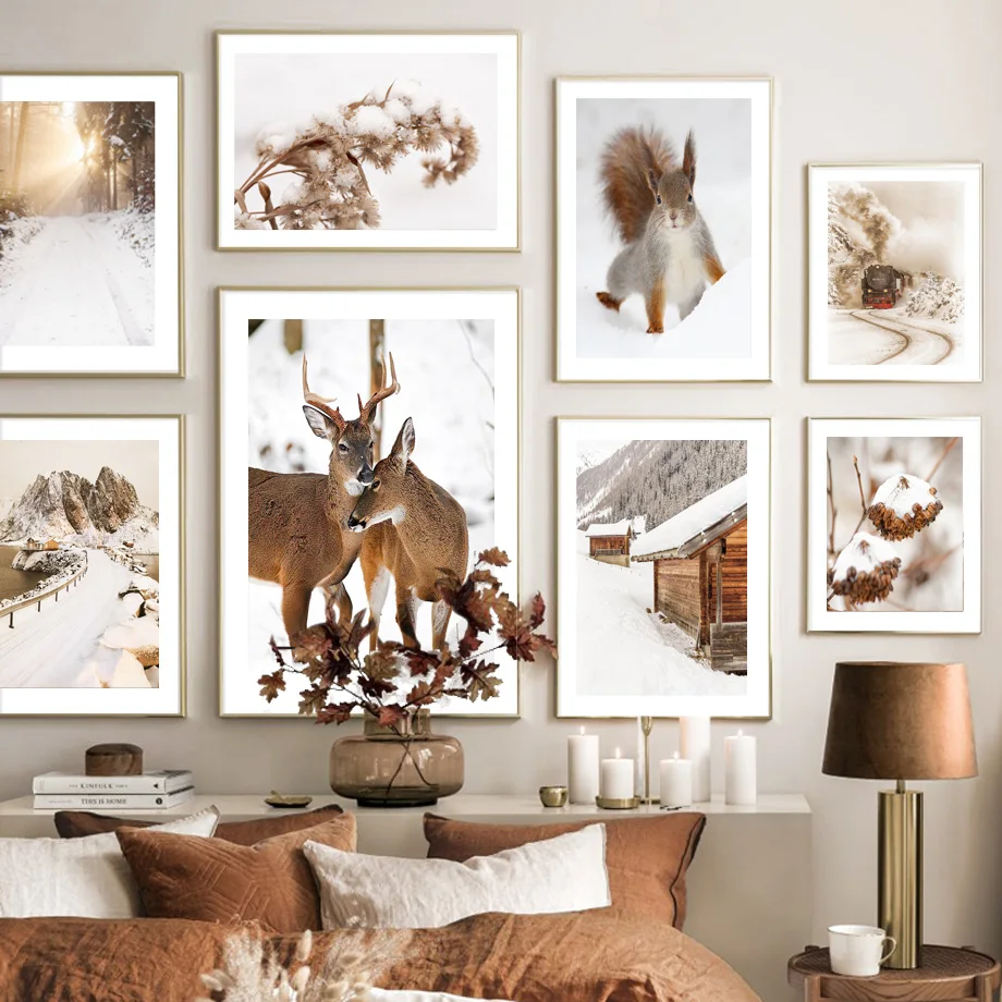 Зимняя сцена олень горный паровой поезд лесное растение скандинавский стиль настенная живопись холст постеры и принты Декор для гостиной
