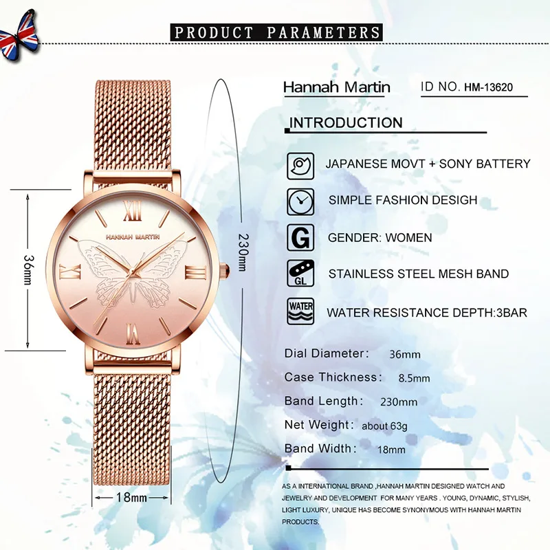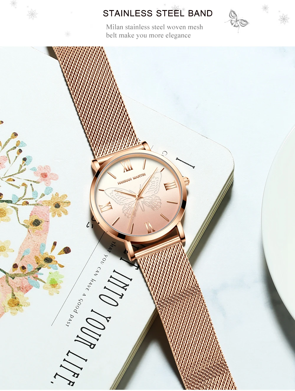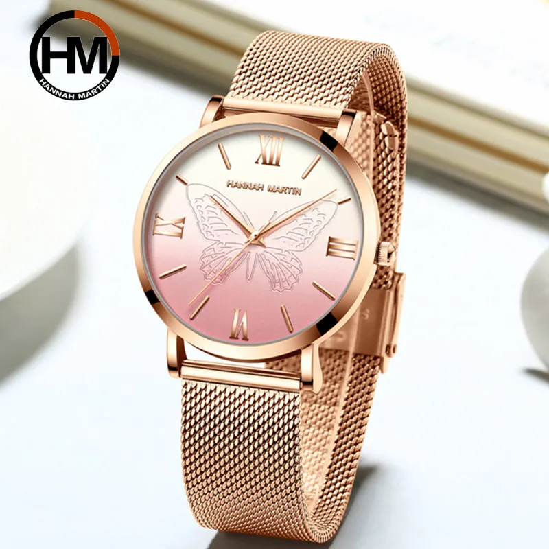 Женские часы Hannah Martin, японские кварцевые часы с 3D ремешком из нержавеющей стали, водонепроницаемые наручные часы, женские часы