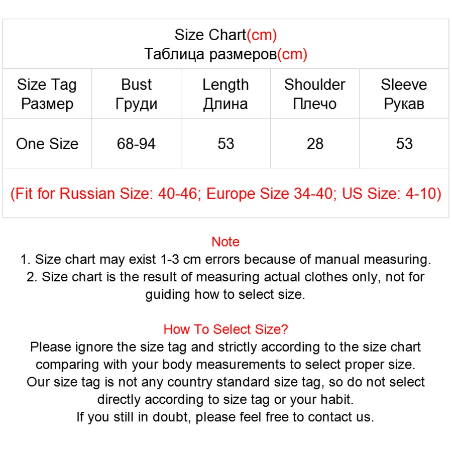 Один размер: обхват груди 68-94;Длина 53; Плечо 28; Рукав 53