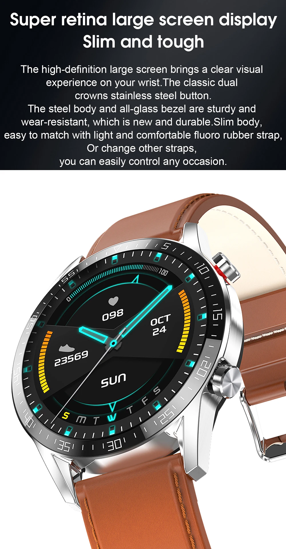 Большой экран высокой четкости дает четкий визуальный опыт на вашем запястье. Классический двойнойКоронки из нержавеющей стали. Стальной корпус и стеклянный ободок прочные и износостойкие, что является новым и прочным. Тонкий корпус, легко сочетающийся с светильник, удобный фторкаучуковый ремешок или другие ремешки можно легко контролировать в любом случае.