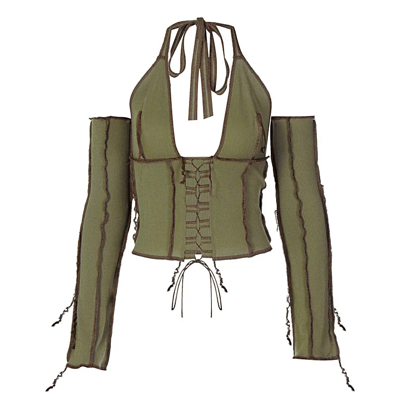 Ажурная Сексуальная футболка Y2K с рукавом и глубоким V-образным вы...