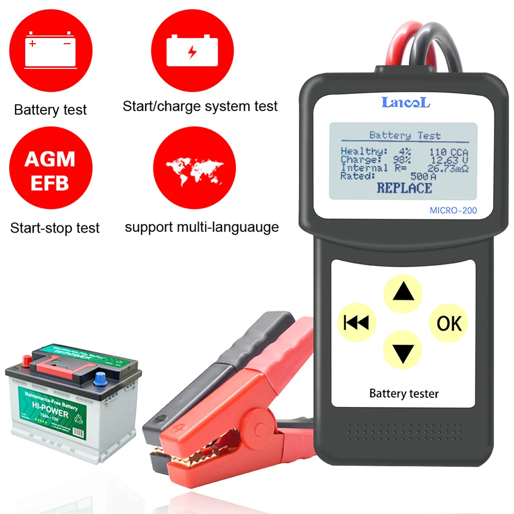 MICRO-200 PRO Этот продукт может быстро и точно измерить фактические холодные Скручивающиеся Ампер способности транспортного средства пусковой батареи, здоровое состояние самой батареи, и общая вина запуска системы транспортного средства и системы зарядки, что может помочь техническому обслуживанию быстро и точно найти проблему, таким образом, чтобы достичь быстрого ремонта автомобиля. Особенности: Светодиодный светильник для отображения состояния батареи. Можно проверить как автомобиль, так и мотоцикл, он идеально спроектирует функцию 3 в 1 и экономит деньги для вас. И это профессиональный тестер батареи, обеспечивающий высокоточные результаты, а также Проверяющий рабочий статус генератора. Это очень профессиональный диагностический инструмент транспортного средства для проверки проблем с системой батареи с цветным экраном и дизайном узора. 12-Напряжение автомобильного аккумулятора и 12-Напряжение АКБ для мотоциклов, универсальный. Индикатор состояния батареи. Usb-кабель для передачи данных, подключенный к компьютерам для печати результатов тестирования. Технология проводимости, тестирование является удобным, быстрым и точным. Характеристики: Материал корпуса: кислотоупорный АБС-пластик Измерение напряжения диапазон: 7-30VDC Диапазон измерения: 40-2000CCA. 3-220ач. Светодиодное освещение три состояния: тонкий (зеленый), слабый (желтый), замена (красный) Температура рабочей среды: -20 ℃-50 ℃(-4 ℉-122 ℉) Допуск: CCA<± 10; Напряжение ± 0.5% Вес: 250 г/8,8 унции Размер посылка: 110*60*50 мм/4,3*2,4 * 2.0in Посылка Вес: 348 г/12,3 унции Поддержка нескольких языков: Материковая версия: английский, русский, корейский японский. Европейская и американская версия: английский, французский, испанский, итальянский, немецкий. Скандинавская версия: английский, финский, голландский, норвежский, шведский, датский Упаковочный лист: 1 * тестер автомобильного аккумулятора