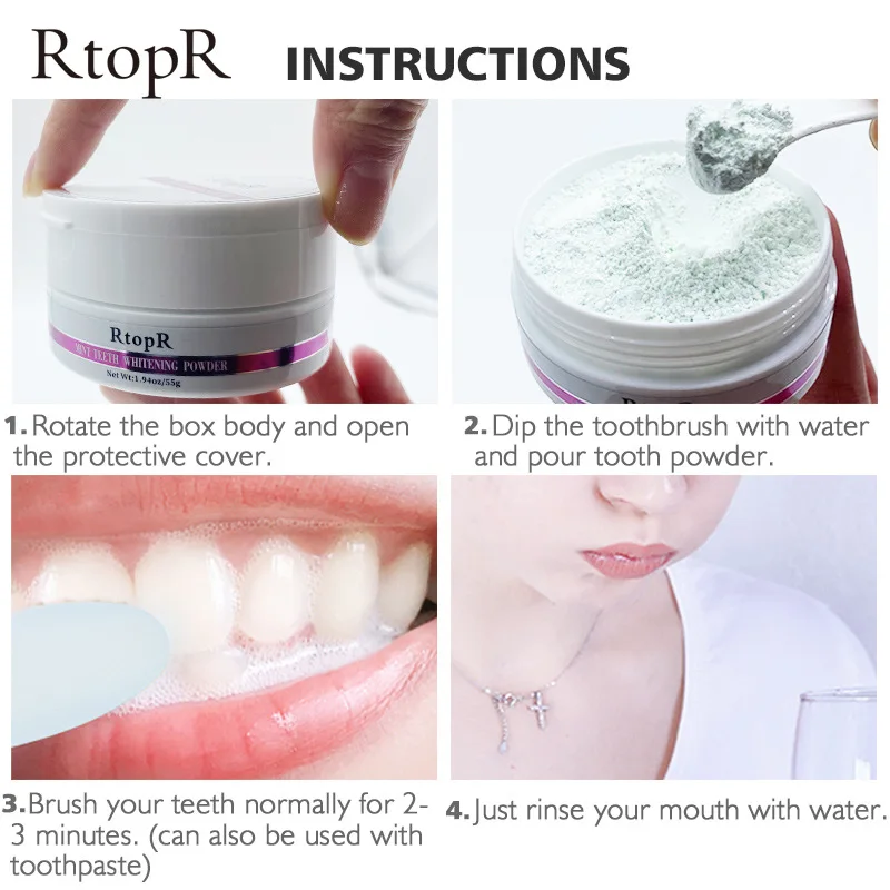 ★Новая технология отбеливания▶Несколько факторов отбеливания, мягко осветляют и защищают зубы.Удалите от зубных пятен √Свежее дыхание √Защита десен √▶Инструкции по использованию1. Поверните корпус коробки и откройте.2. Окуните зубную щетку водой защитным чехлом и Налейте зубной порошок.3. Чистить зубы обычно в течение 2-3 минут. (также можно использовать сЗубная паста)4. Просто намочите рот на краску.