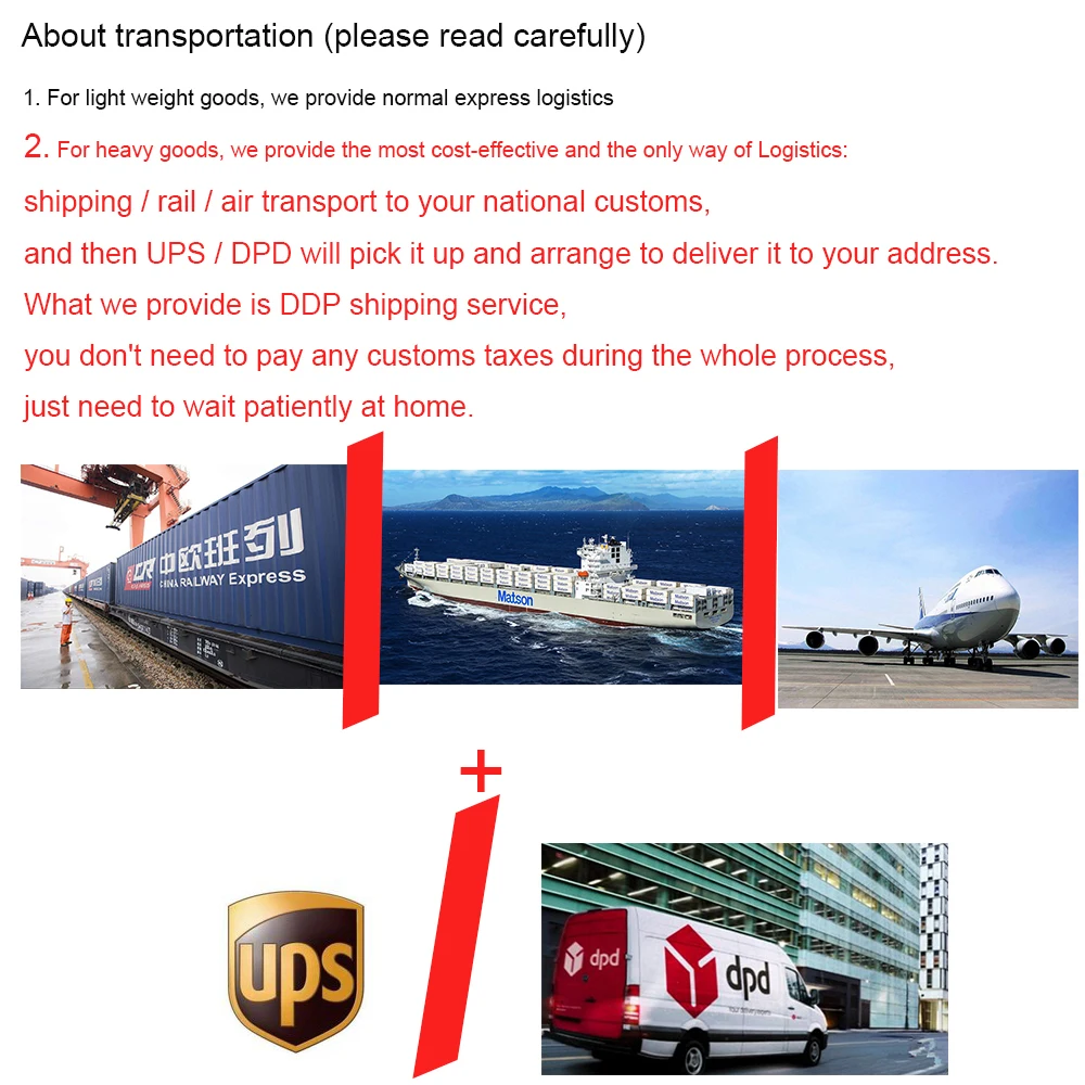 1. Для легковесных товаров, мы обеспечиваем нормальную Экспресс-логистику 2. Для тяжелых грузов, мы предоставляем наиболее экономичный и единственный способ логистики: Доставка/Железнодорожная/воздушная перевозка до Вашей национальной таможни, а затем UPS / DPD заберет его и организует доставку по вашему адресу. Вам не нужно платить какие-либо таможенные налоги в течение всего процесса. Мы предоставляем услуги доставки DDP, вам просто нужно терпеливо ждать дома. 3. И некоторые продукты имеют так много различных моделей веса, показанная стоимость доставки берется из размера самого большого веса. Только для справки. Если вы хотите получить самую низкую стоимость, пожалуйста, свяжитесь с нами онлайн.