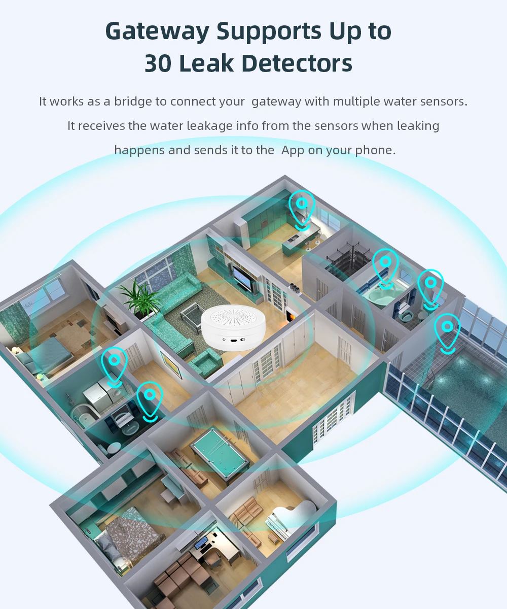 Оповещения в режиме реального времени: Подключите шлюз к Wi-Fi, и он мгновенно отправит уведомления приложений и оповещения на ваш телефон, когда происходит утечка воды, даже если вы не дома. Примечание: не поддерживает 5G WiFi.