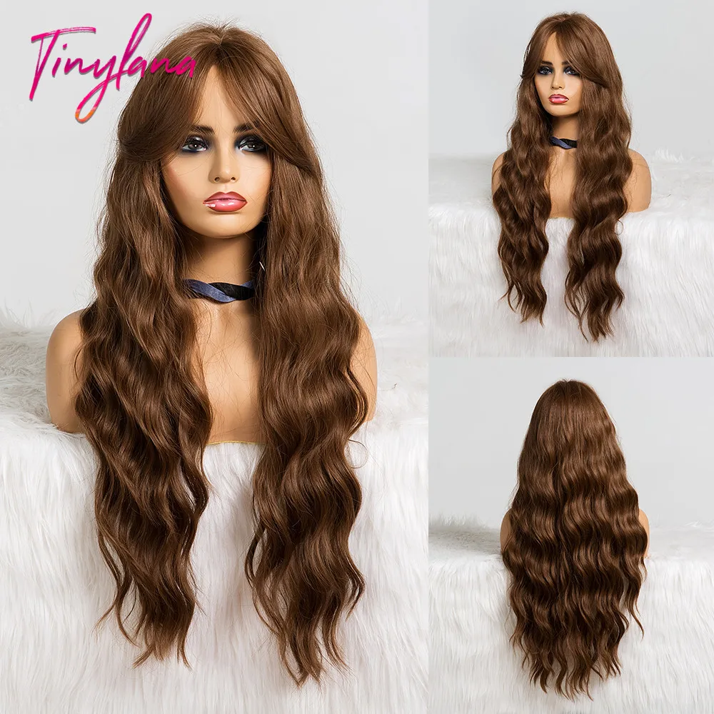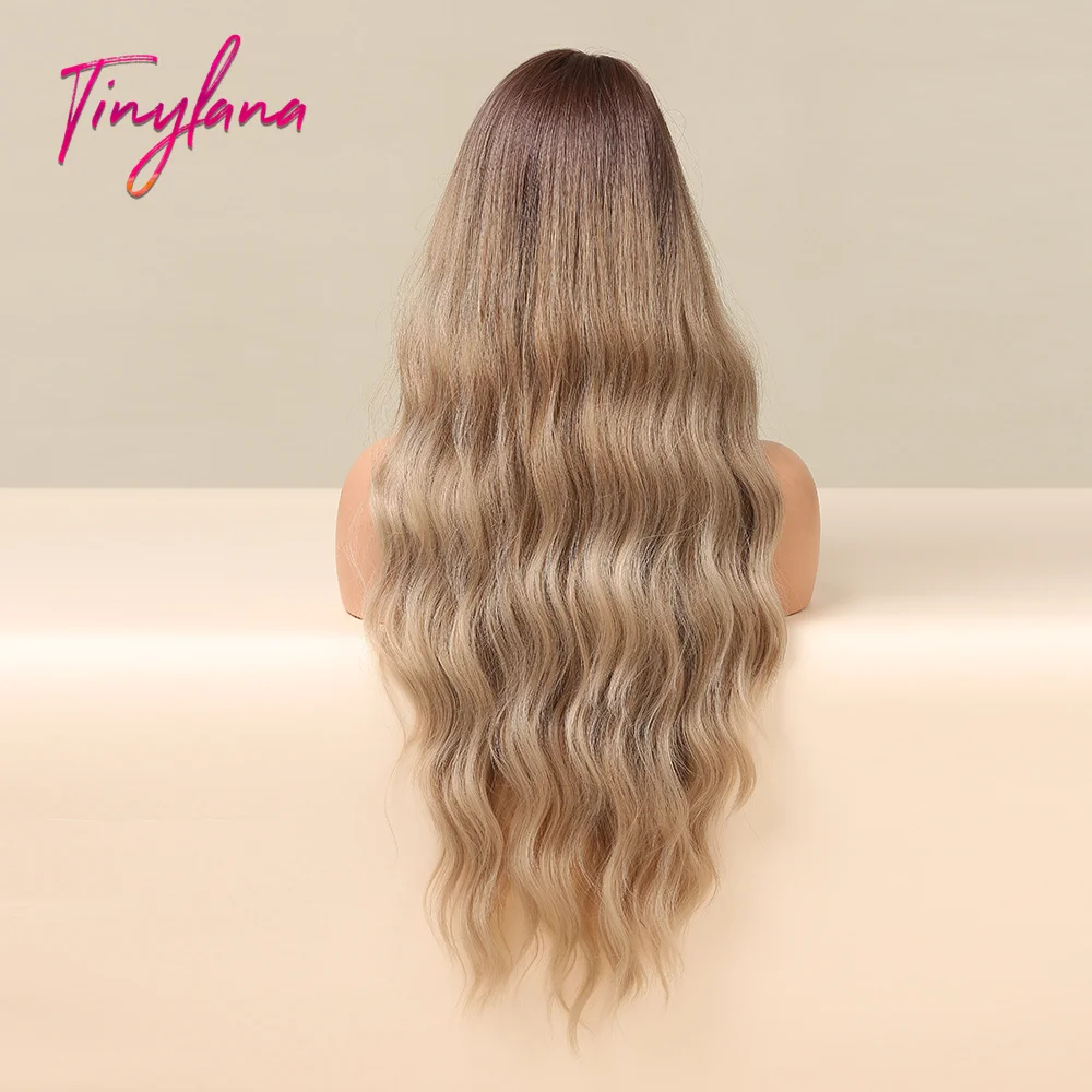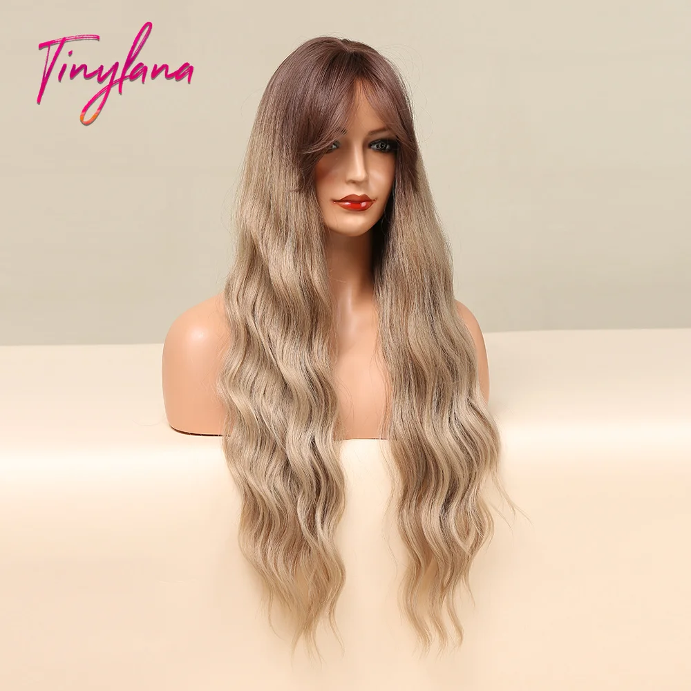 Крошечный LANA, длинные, Омбре, коричневый, блонд, волнистые синтетические парики с челкой для женщин, повседневные, натуральные волосы, косплей, термостойкие парики