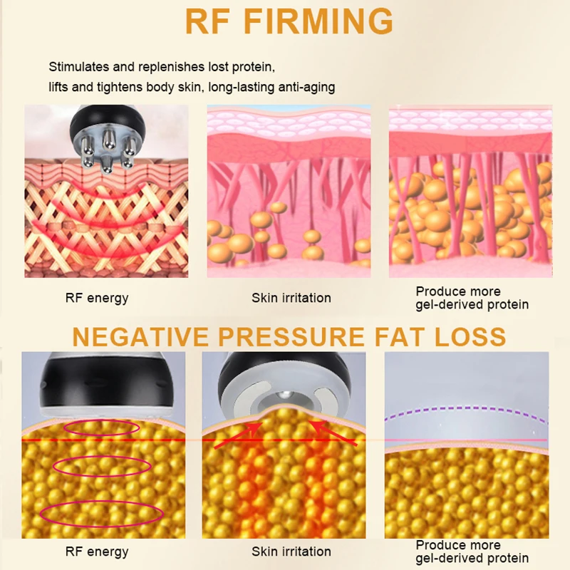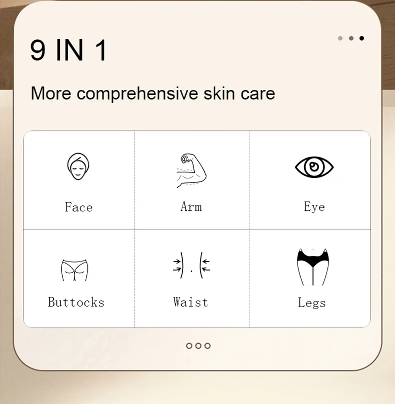 Ультразвуковой зондИмпорт продуктов для ухода за кожей, чтобы проникнуть в кожу, ускорить поглощение, ускорить активацию клеток,Уменьшает пигментацию и морщины, осветляет кожу, защищает от старения.Лицо RFИспользуя R технологии, коллаген дермы постепенно пролифератируется через эффект, улучшает долгосрочный эмоциональный стресс, старение лицаИ тусклой черной кожей. Он может способствовать метаболизму клеток и регенерации, делает кожу упругой, блестящей и гладкойУкрепляющая кожа.Вакуумный и биполярный зондЗонд выполняет аэробные упражнения для кожи и жировой ткани, такие как разминание и прокатка, которые делают лимфодренажную функциюИ кровообращение увеличивается в 4 раза. В то же время, наряду с биполярной энергией R с глубоким массажем, делая жировые клеткиВ жирные кислоты, и устраняются лимфатической циркуляцией, чтобы эффективно потреблять накопительные жировые клетки и достичь эффекта формирования.Холодный молотокХолодный молоток лечит отеки, снимает боль в части тела, сокращает поры, успокаивает воспаление и снижает гипервосприимчивостьЛазерЛазер, также известный как мягкий лазер, холодный лазер или низкоуровневая лазерная терапия, использует красный светильник 650nm Лазерная энергия для проникновения кожи, когдаЖировые клетки имитируются, клеточная мембрана создает поры для высвобождения жирных кислот и глицерина. Отзывы показывают, что при физических упражнениях или инфракрасной терапии жировые клетки будут сжигаться или сливаться лимфатической циркуляцией.1. Ультразвуковое разрывание жира:Сжимаемая жировая энергия применяется к определенной области лечения, чтобы разрушить клетки в подкожной клеточной мембране.2. Радиочастотная подтяжка кожи:Улучшает упругость, способствует естественному сопротивлению подкожной клетчатки, тренирует пролиферацию коллагена.3.RF снижение жира отрицательного давления:Ускоряет сжигание жира, лимфодренаж, вакуумное всасывание внутреннего жира, радиочастота нагревает стенку клеток и изменяет форму тела.4. Лазерный липолиз и скульптура тела:Длина волны 635-650 нм, лазерная доска связана с определенной областью, выделяет энергию Красного светодиодный, проникает в слой жира, И использует тепло, чтобы растворить подкожный жир для достижения эффекта скульптуры тела.5. Разные цвета светильник + микро-электричество:Цветной светильник для омоложения кожи, непосредственно облучает поверхность кожи, проникает в глубокий слой кожи, уменьшает морщины и восстанавливает эластичность кожи.6. Анальгезия охлаждения льда:Сужает поры, эффективно препятствует разрыву капилляров, подавляет покраснение и подавляет воспалительные реакции.7. Микроэлектрическая терапия патч:Пластырь привязывается к определенной области, EMS импульсный ток стимулирует нервы, вызывает сокращение мышц и движение, которое вырабатывается пассивными упражнениями для формирования и укрепления мышц.Функции:1. Лифтинг и Ремоделирование лица и шеи2. Затягивание и подъем вялых участков лица3. Уменьшает морщины/подтягивает провисание кожи4. Улучшает яркость кожи5. Уменьшение жира6. Ремоделирование тела7. Лечение целлюлита и частичная реконструкция кожи8. Увеличение уровня коллагена9. Затягивание кожи10. Сужает поры