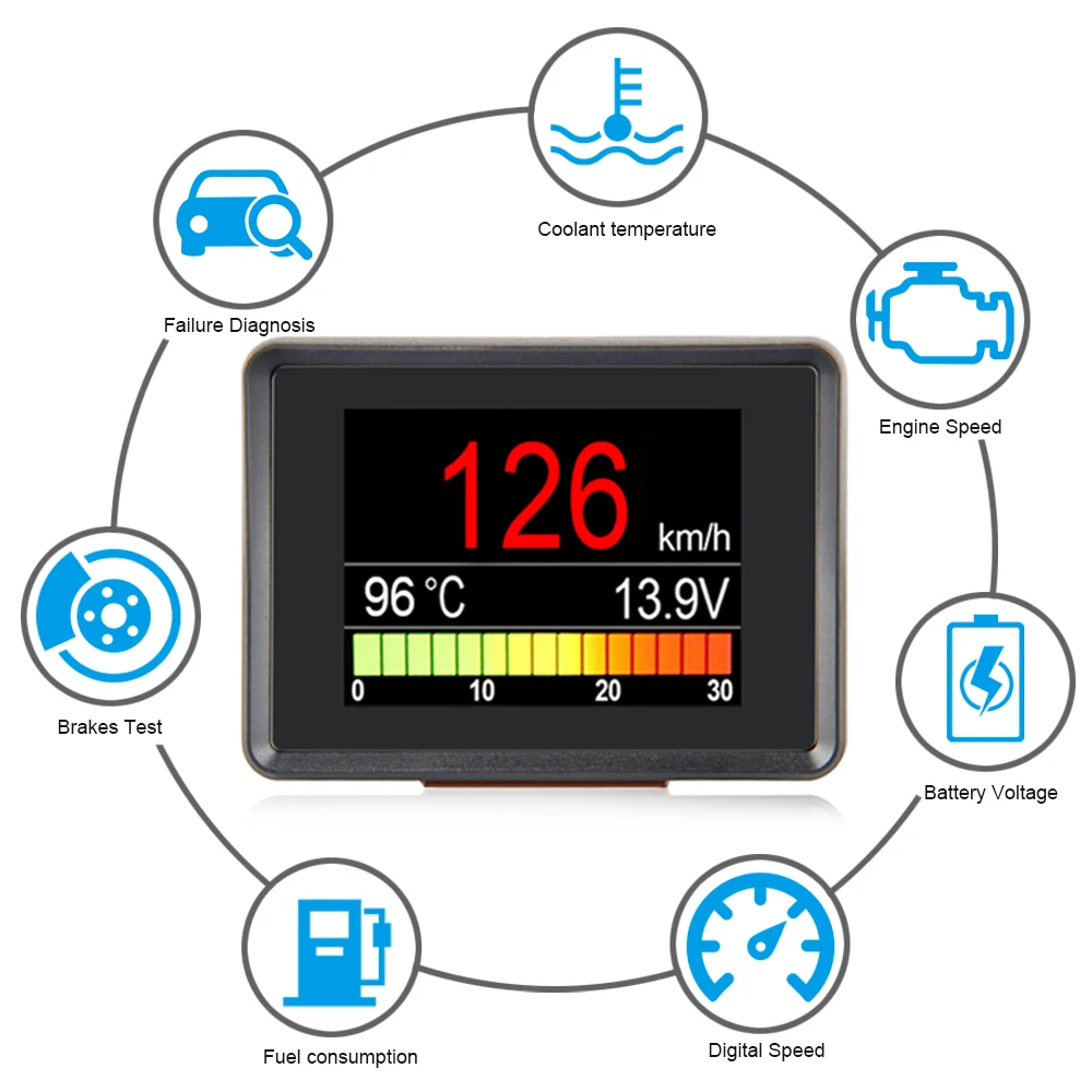 A203 OBD mini car trip computer-это небольшой автомобильный инструмент с мощными функциями, который особенно подходит для автомобилей без тахометра, датчика температуры двигателя и функций отображения расхода топлива.A203 может также отображать и контролировать напряжение батареи транспортного средства, напряжение зарядки генератора, предлагая транспортное средство с превышением скорости сигнализации, высокой температуры двигателя сигнализации, мониторинга и других функций. Он даже может считывать потоки данных о транспортном средстве, сканировать коды неисправностей двигателя и предлагать функции очистки кода неисправности.