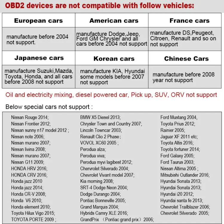 Устройство OBD2 не совместимо со следующими транспортными средствами: