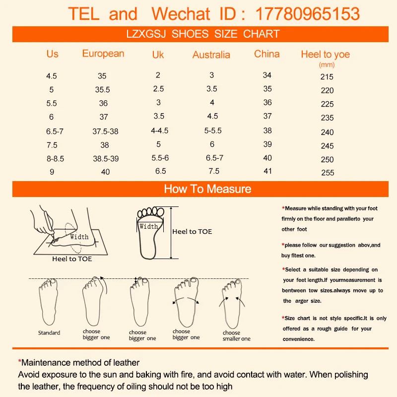 Вот содержание продукта1. Пожалуйста, выберите размер в соответствии с вашей стопой, пожалуйста, сообщите мне, если есть какие-либо проблемы2. Мой магазин может изготовить обувь, которая вам нравится. Если вам нужно сказать мне, у меня есть собственная фабрика3. Мой магазин будет продолжать обновлять товары, я надеюсь, вы можете обратить внимание4. Из-за разницы во времени, я отвечу вам вовремя, когда увижу новости, которые вы мне дали. Надеюсь, вы понимаете этоА: В соответствии с нашей таблицей размеров выберите подходящий для длины вашей стопы размер обуви.Выберите оптимальный размер в соответствии с параметрами вашей ноги (длина стопы). Если вы сомневаетесь и не знаете, какой размер выбрать, рекомендуется заказывать обувь на размер больше.Вопрос: Я оплатил заказ. Через сколько дней я смогу его получить?A: уважаемые покупатели, отгрузка товаров осуществляется, как правило, по прохождении 1–6 рабочих дней с даты обработки вашего платежа. Сроки доставки составляют от 15 до 50 дней.В: должен ли я оплачивать ввозную пошлину?A: это зависит от нормативных правил для импорта и экспорта в вашей стране, если возникла необходимость оплаты таможенных сборов, они должны быть оплачены покупателем. Если необходимо указать стоимость посылки, пожалуйста, сделайте примечание с подробной информацией.