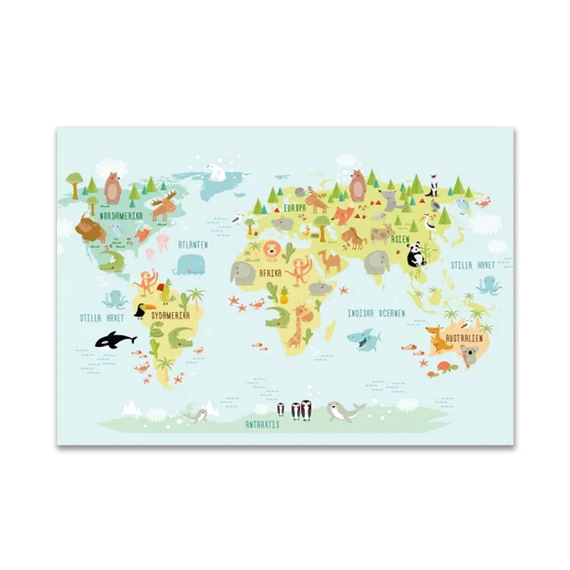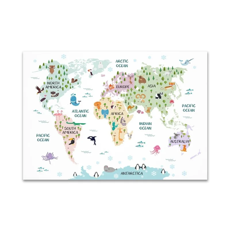Карта мира, плакаты и принты, Пастельная животная тема, образовательная детская Картина на холсте, настенное искусство для детской комнаты, декоративная картина