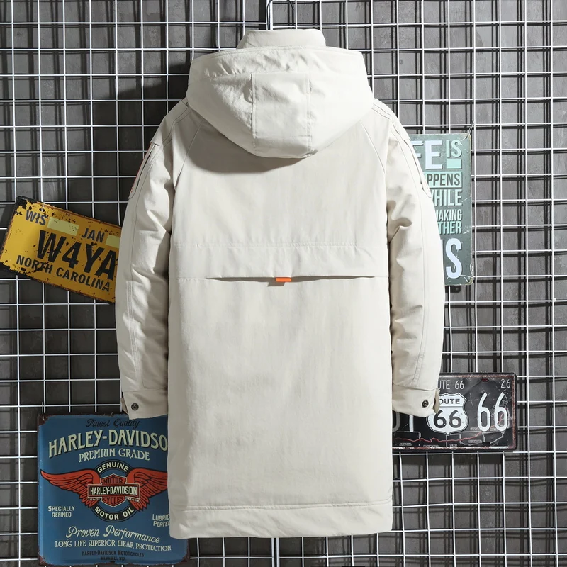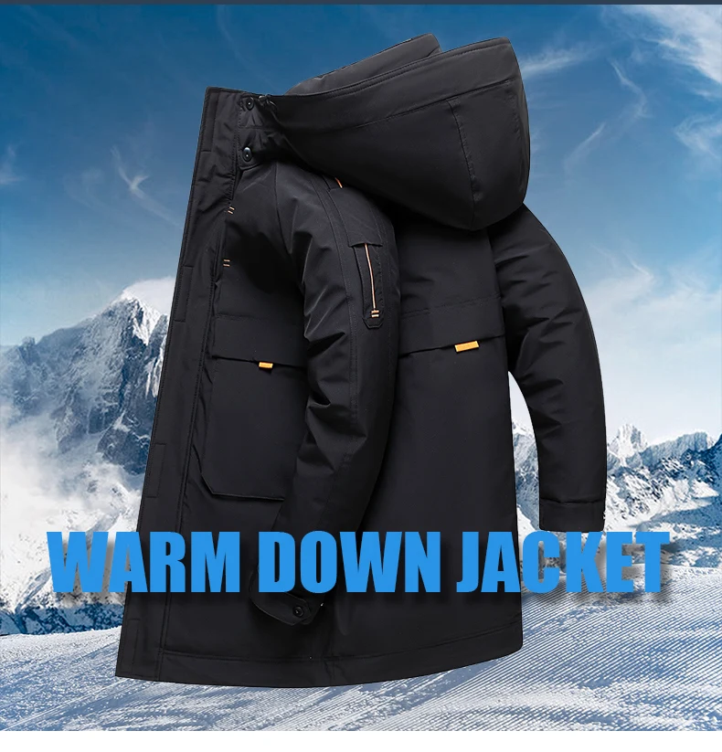 Мужской пуховик средней длины, с капюшоном, на белом утином пуху
