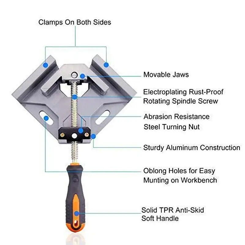 Идеальный угловой зажимПозволяет соединять два деревянных блока различной толщины под углом 90 градусов, которые могут зажимать материалы, такие как стальной стержень, металлическая трубка, дерево, толстое стекло и т. д. Отлично подходит для обрамления, сверления, приданого и многого другого.