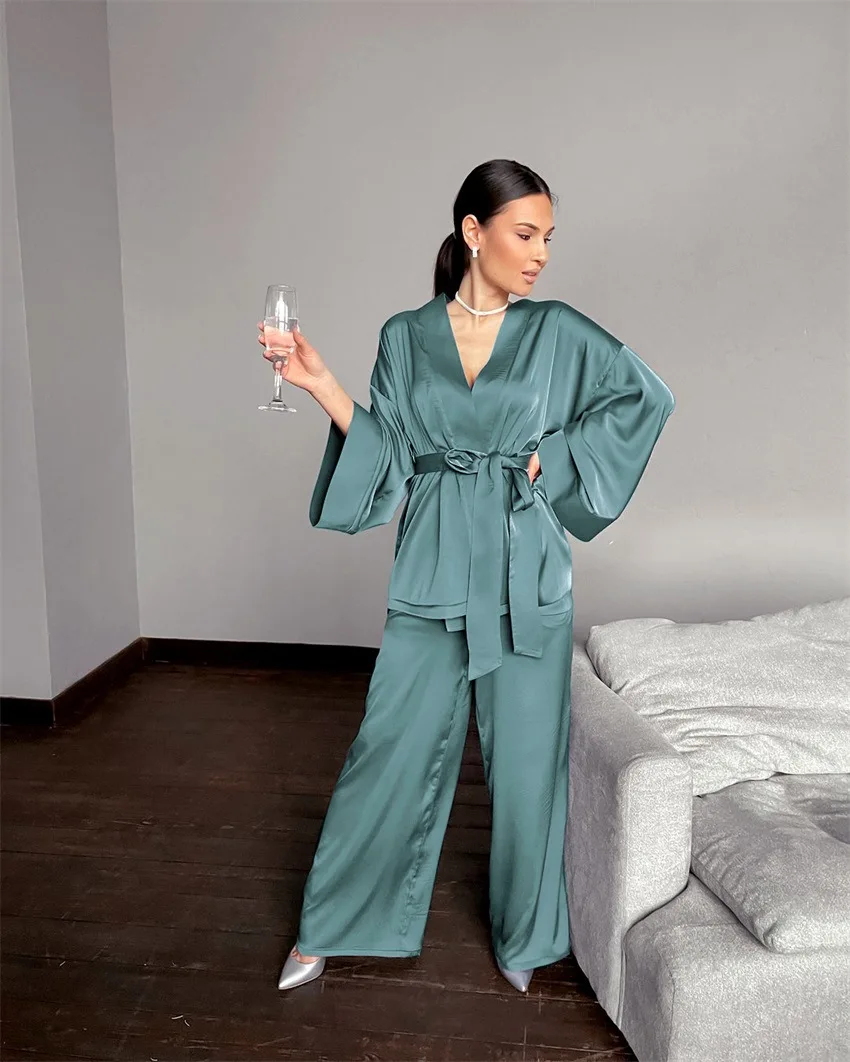 Женская пижама, сексуальный осенний атласный комплект с длинным рукавом, кардиган, кружевная ночная рубашка, домашние свободные штаны, пижамный комплект Advanced