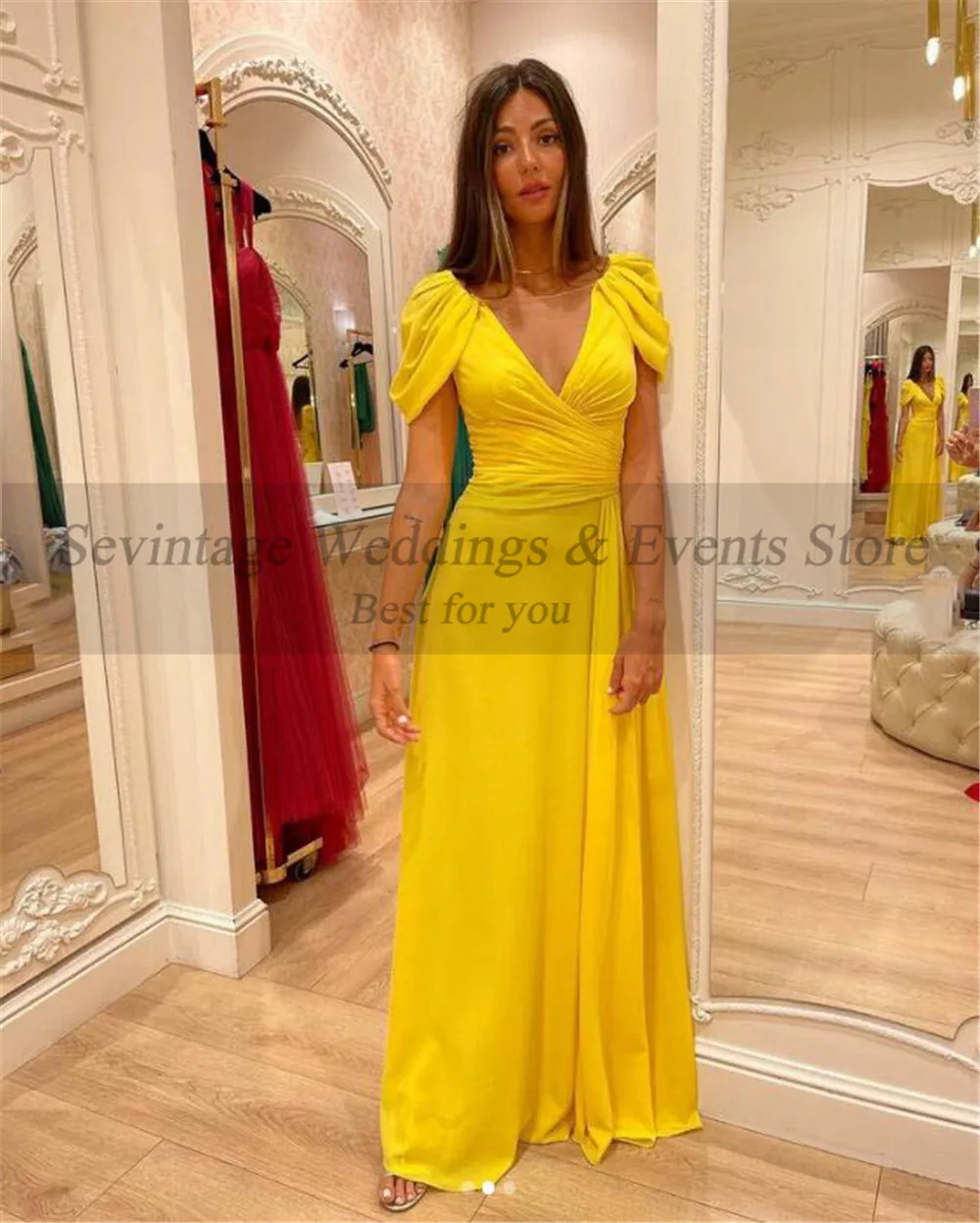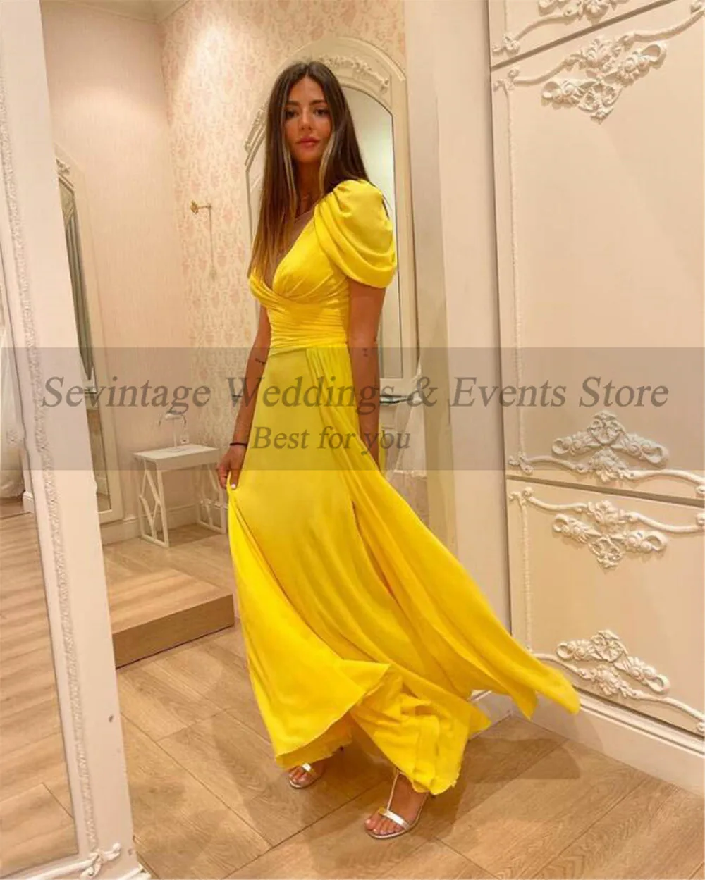 Женское длинное шифоновое платье Sevintage, желтое Плиссированное вечернее платье телесного цвета с круглым вырезом и рукавами-крылышками, наряд для вечеривечерние или выпускного вечера