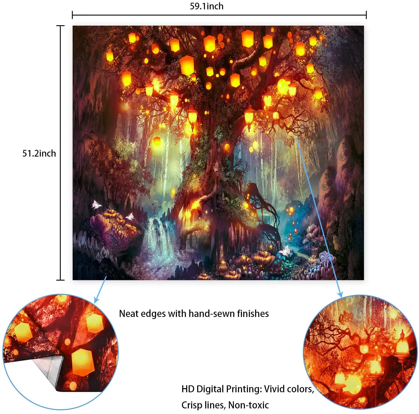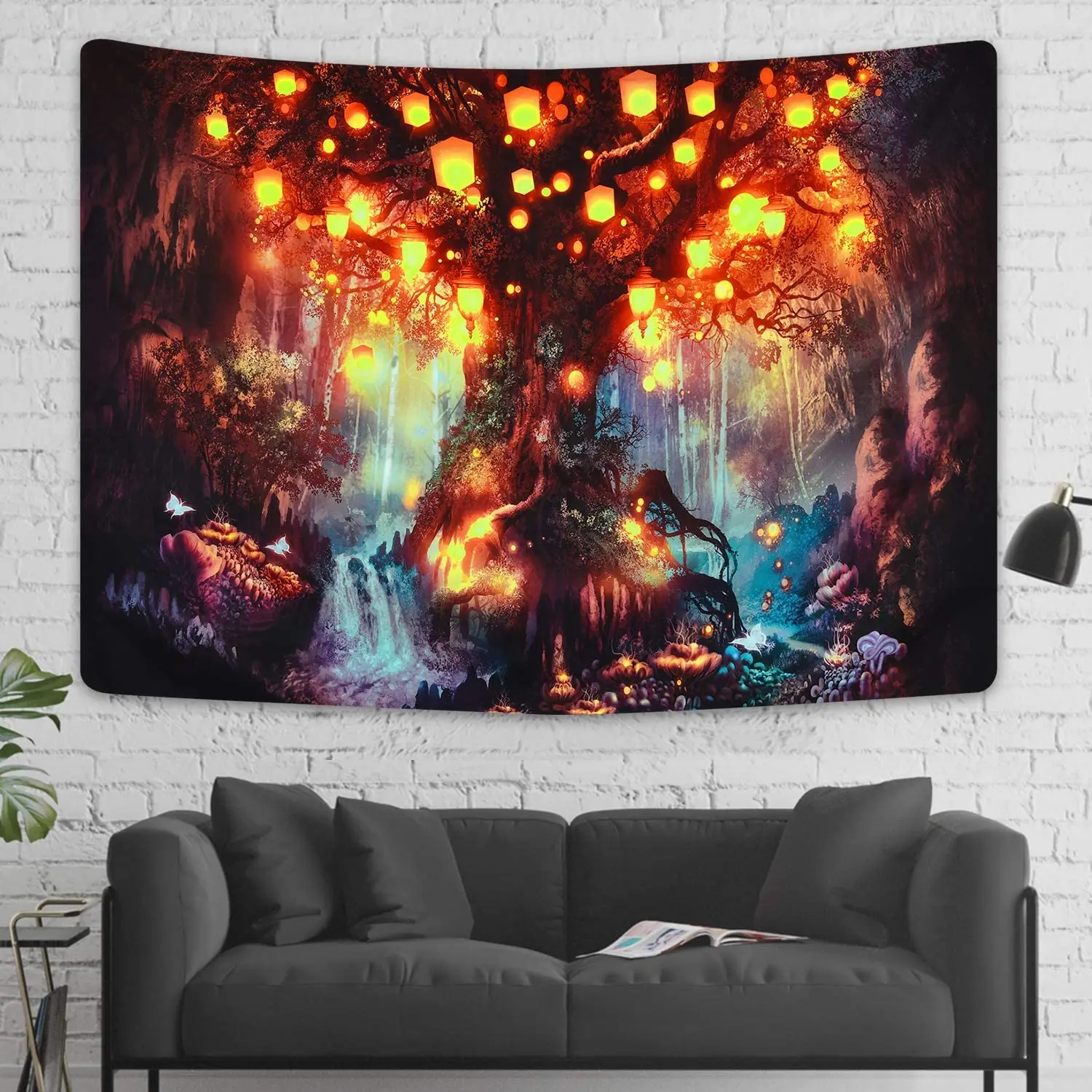 Сказочный лес, гобелен, волшебное дерево жизни, гобелен, мистическое сияние, водопады под старинным зачарованным