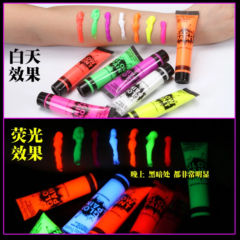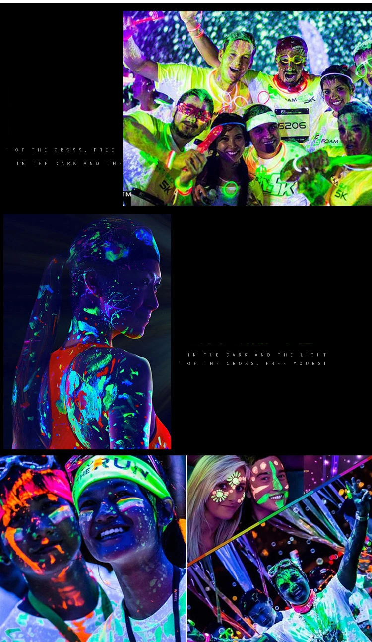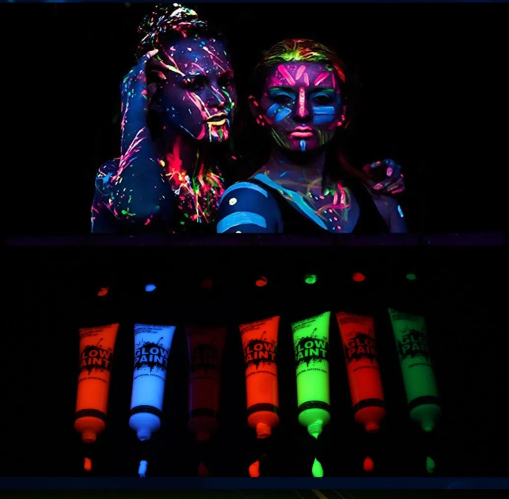 Особенности: Подходит как для дневного, так и для ночного использования Яркие, цветные при нормальном освещении, краски дают огромное люминесцентное свечение при УФ-освещении/черном освещении Эти краски легко наносятся, быстро сохнут на коже и прослужат всю ночь. Просто промойте водой после использования Наши краски сертифицированы по косметике и отвечают всем требованиям Согласно директиве ЕС по косметике Продукт нуждается в ярком светильник за десять минут, а затем смотреть в темноте